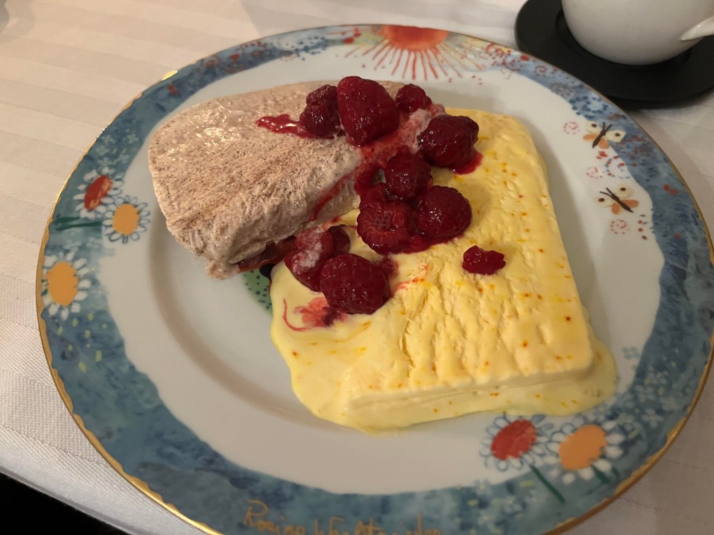 Till efterrätt blev det kanel- och saffransparfait med hallon. Detta är ett recept jag gör varje jul och de allra flesta brukar älska det.
