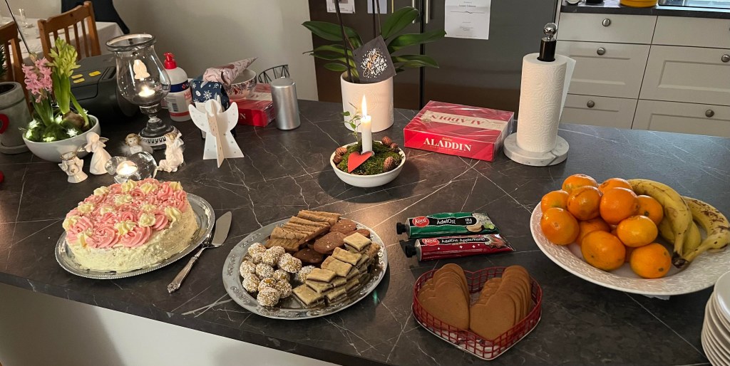 Innan tolvslaget blev det kaffe, te, frukt, kakor, tårta och choklad. Vi åt och njöt.