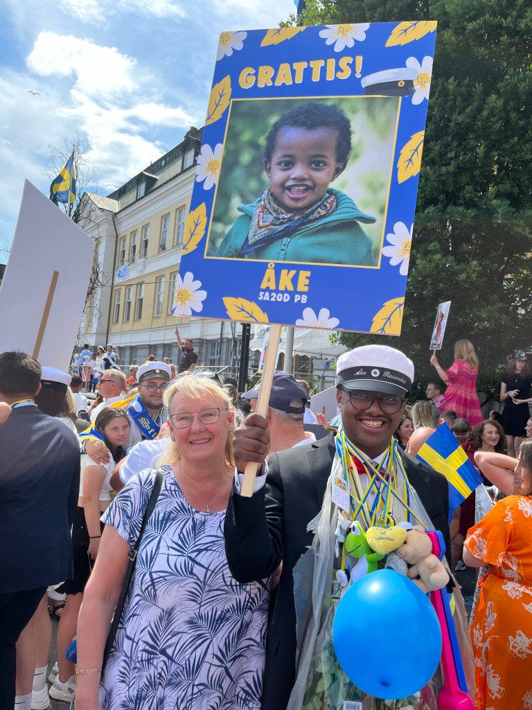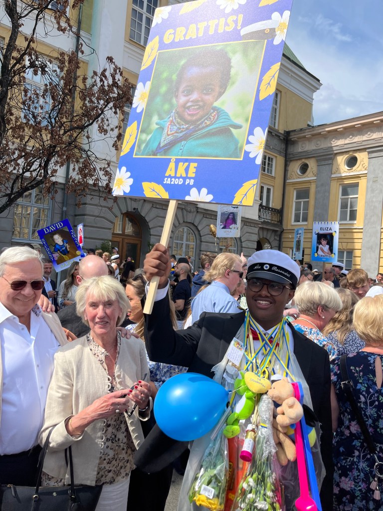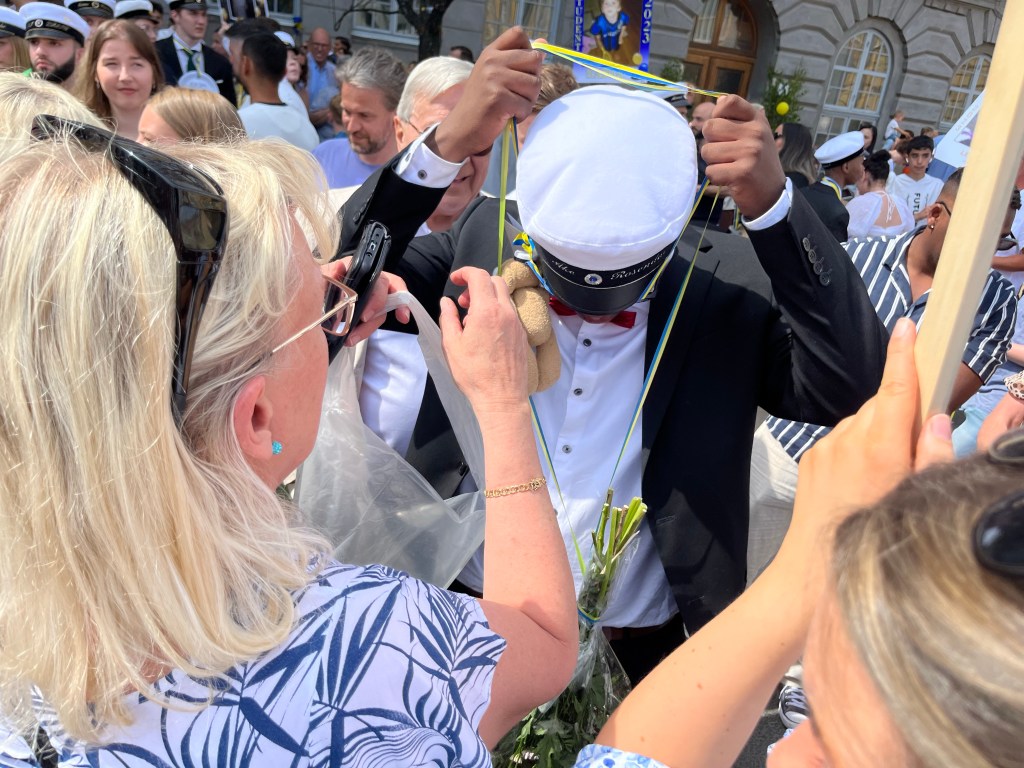 Det har varit en underbar glädjefylld dag då goe fine Åke har tagit studenten. Det var utspring på Per Brahegymnasiet strax efter kl 14.00 och då var släkt och vänner samlade. Det är något visst med studentexamen. Det är så mycket glädje i luften. Det kommer alltid några tårar från mina ögon en dag som denna. Här är mamma Monica på G med att gratulera.