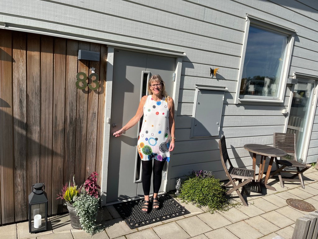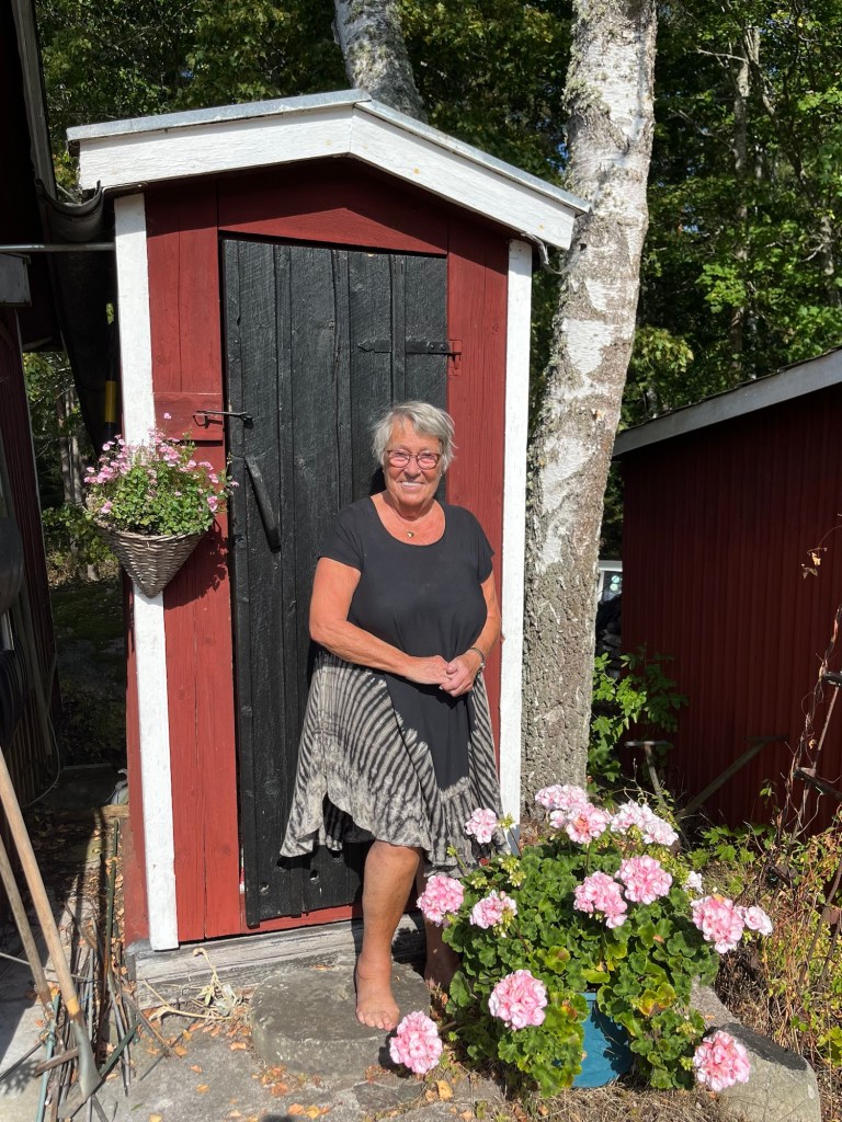 Barbro poserar glatt utanför utedasset.