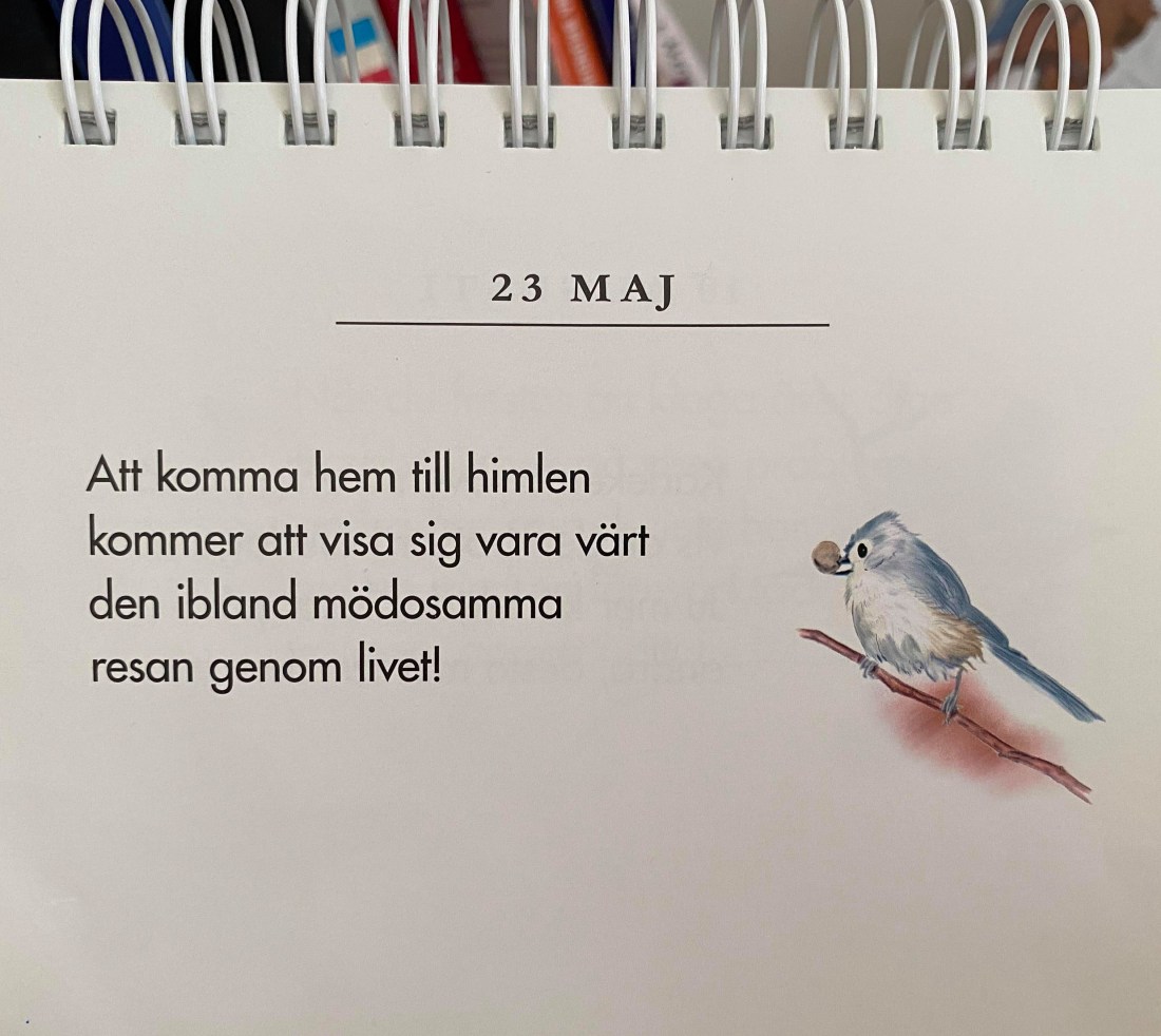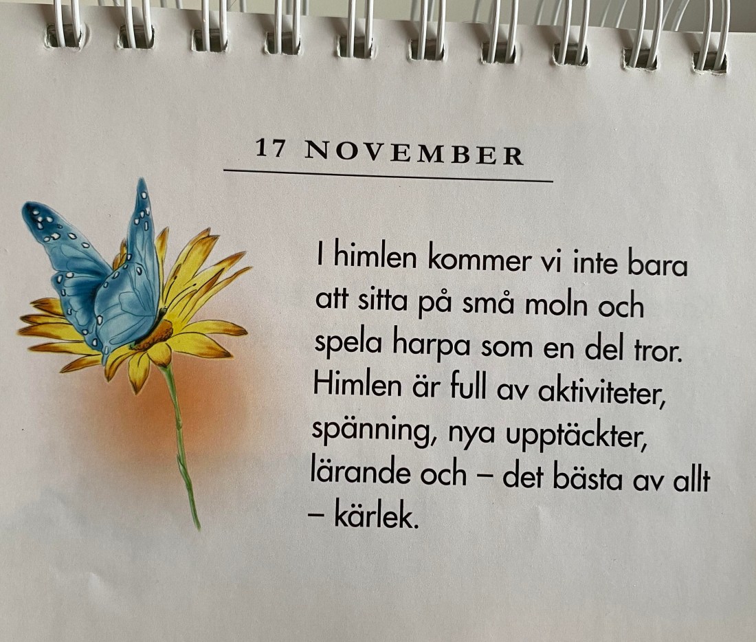 Kära mamma! Idag är det ett år sen du flyttade till himlen. Din död, som jag bävat inför, blev något vackert tack vare att du var så trygg i din tro och strålade mot oss alla in i sista stund. Den 5 januari är ingen sorgens dag, nej, det är en vacker dag. Det var då jag fick hålla dig i handen när du flög iväg till Evighetens ljusa värld. Jag saknar dig mamma men livet går vidare och det går bra. Tack för alla ljusa minnen! Vi ses igen! ❤️