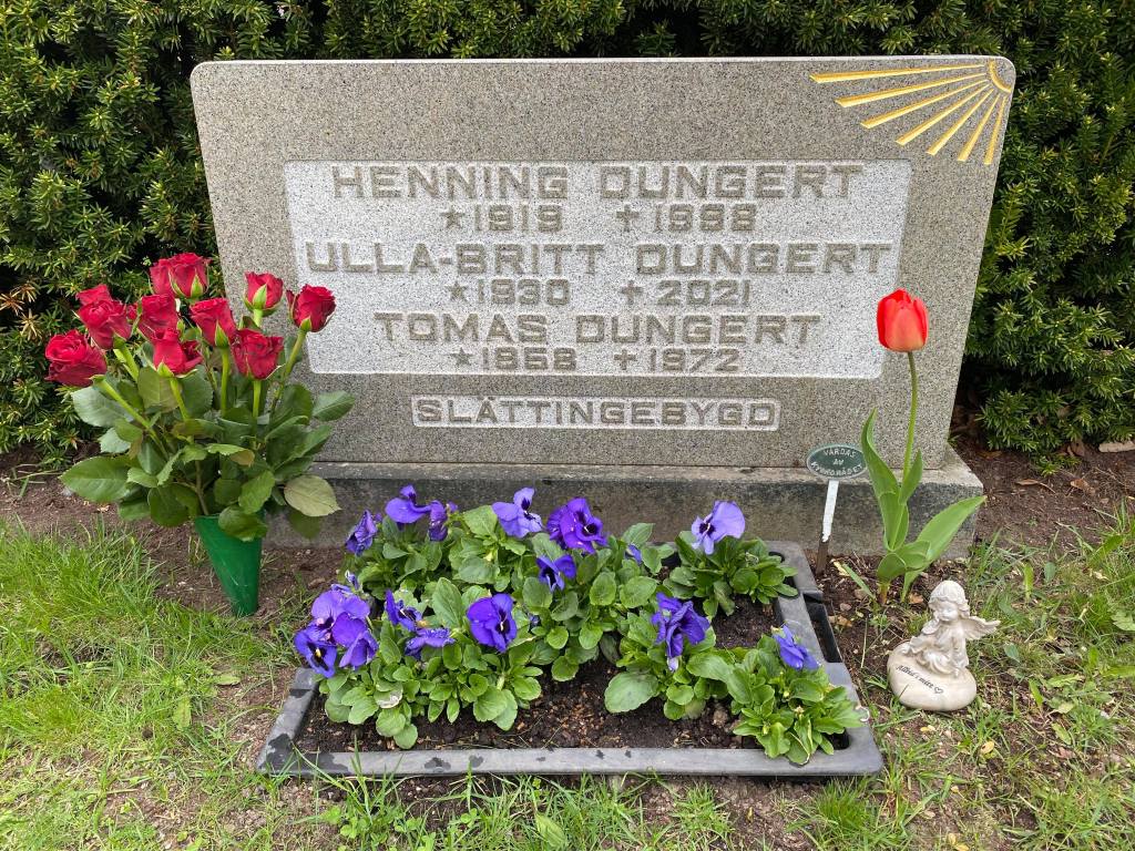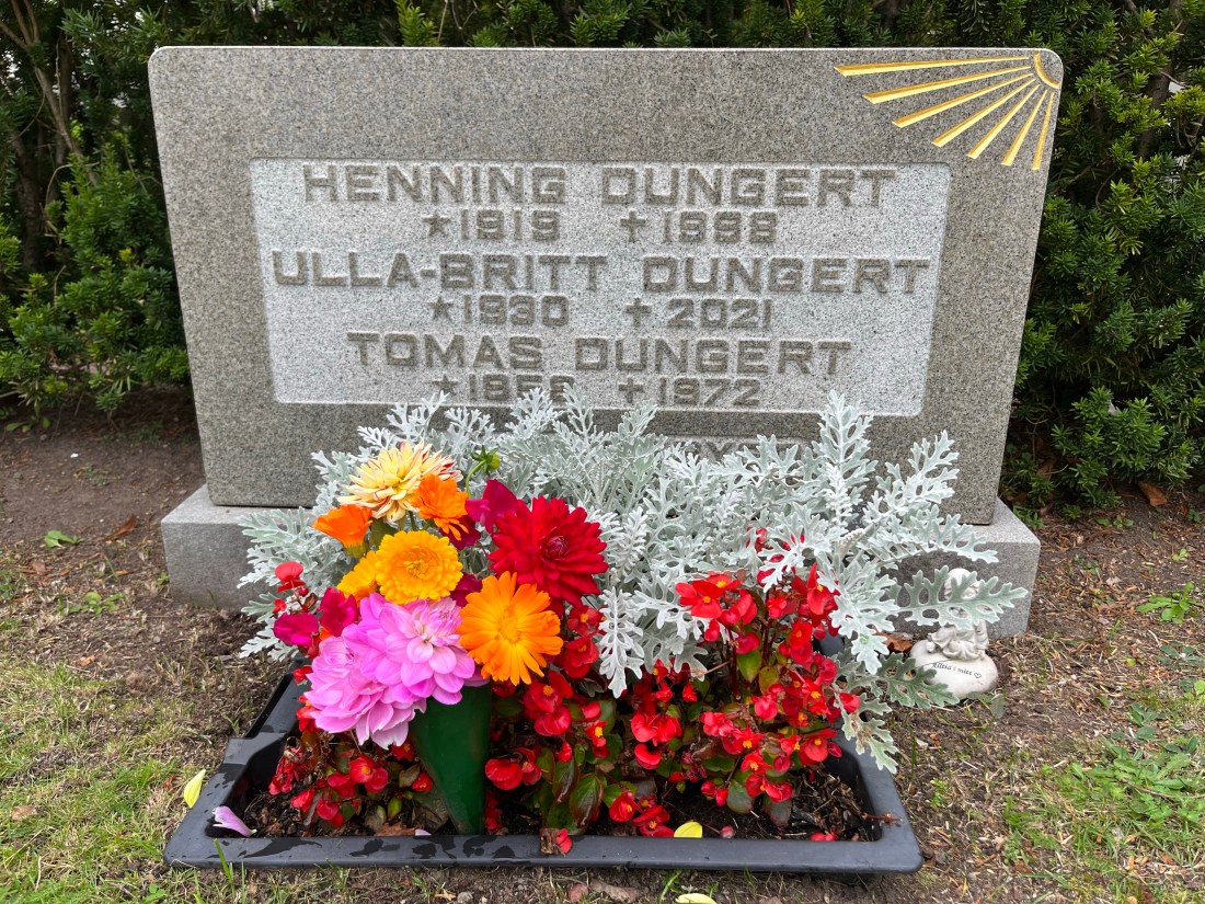 Min bror sänkte ner urnan i jorden och vi satte en bukett röda rosor i en vas och lade dit en ängel som sitter så fint på ett hjärta. Här är gravplatsen för vår mamma, vår pappa och vår storebror Tomas som dog när han var 14 år.