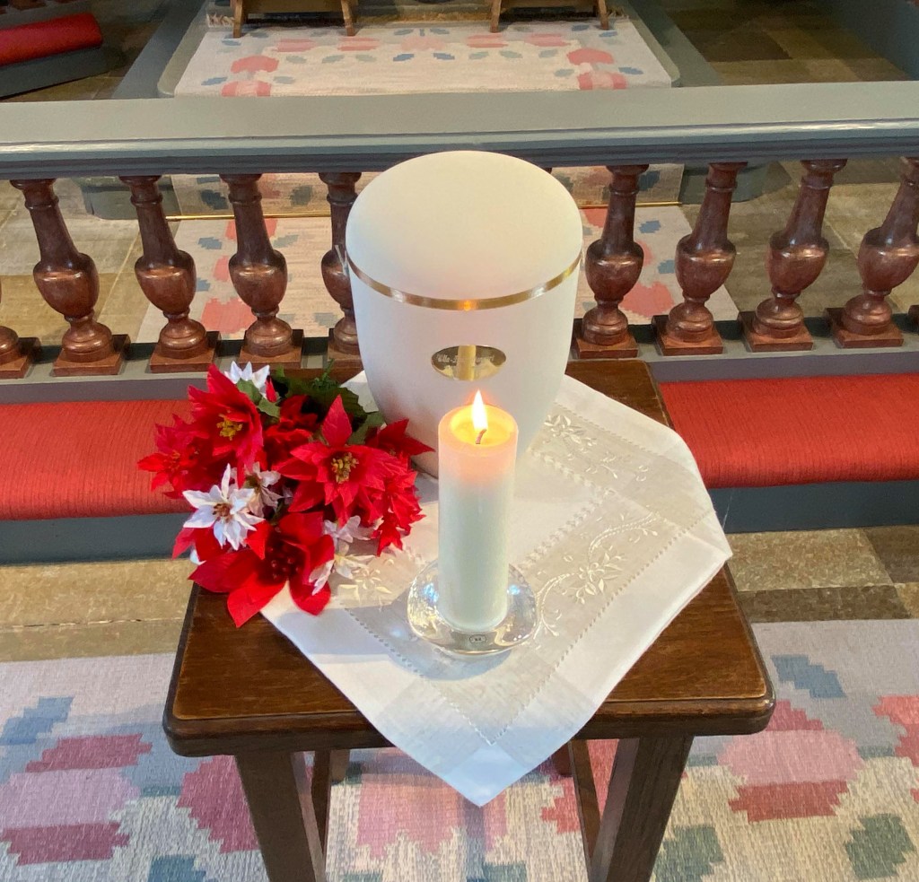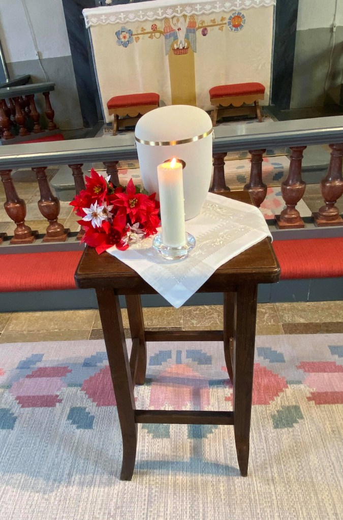 Kyrkvaktmästaren hade förberett allt så fint. Han hade ställt urnan på ett bord inne i kyrkan där han tänt ett ljus och lagt en bukett med sidenblommor.