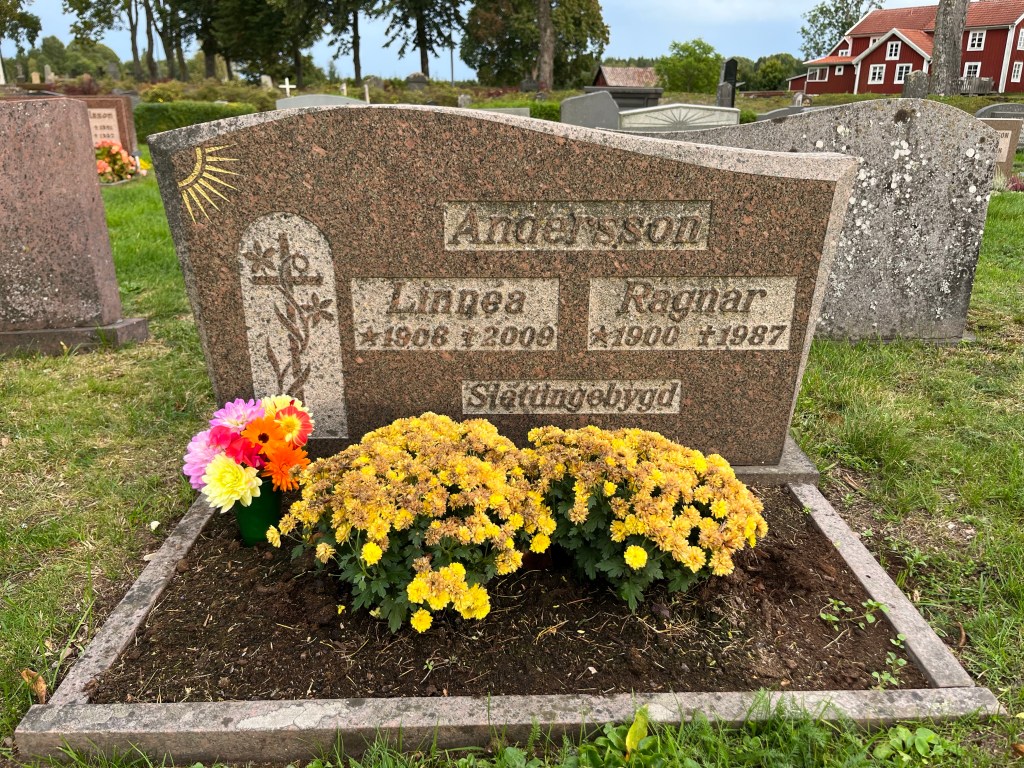 Idag besökte jag Kristvalla kyrkogård där många nära och kära ligger begravda. Det kändes så fint att få placera mina egenodlade blommor vid gravarna: dahlior, ringblommor och luktärter. Ovan ser vi graven för mamma, pappa och min bror Tomas