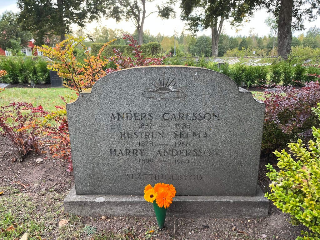 Nedan är det mormor och morfars grav samt en grav för min morfars mor och far samt hans bror Harry. Den sistnämnda graven är ”borttagen” men finns ändå kvar. Jag passade på att sätta några ringblommor i en vas där också. Harry har jag träffat. Han bodde i Slättingebygd när jag var ung och honom har jag varit hos många gånger och han har varit hos oss. Han var min mammas farbror och en god vän till vår familj.