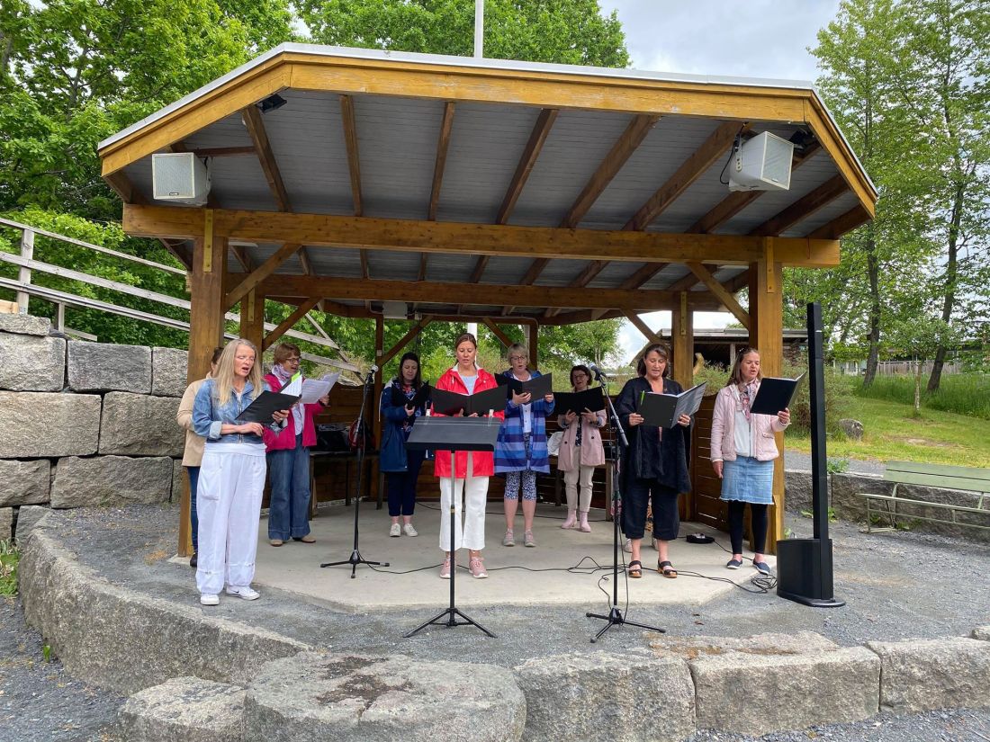 Nu är vi uppe på toppen av Varkullen där vi avnjuter saft och fruktsallad. Mums! Från Varkullen har man en vacker utsikt mot stan och Vättern.