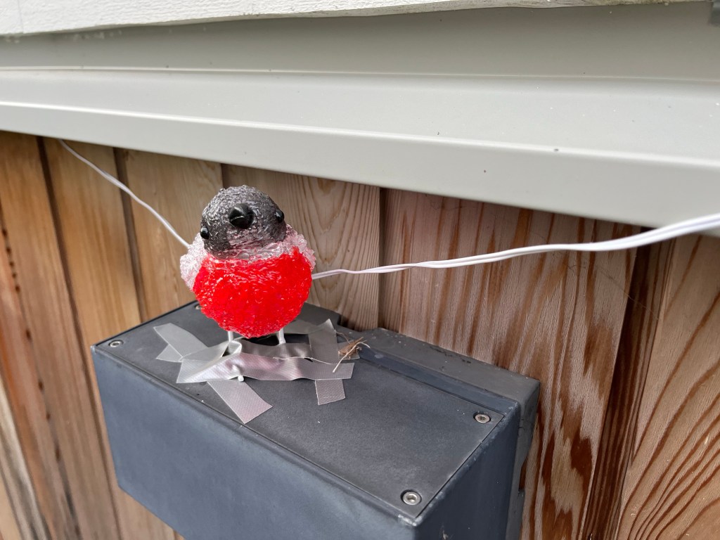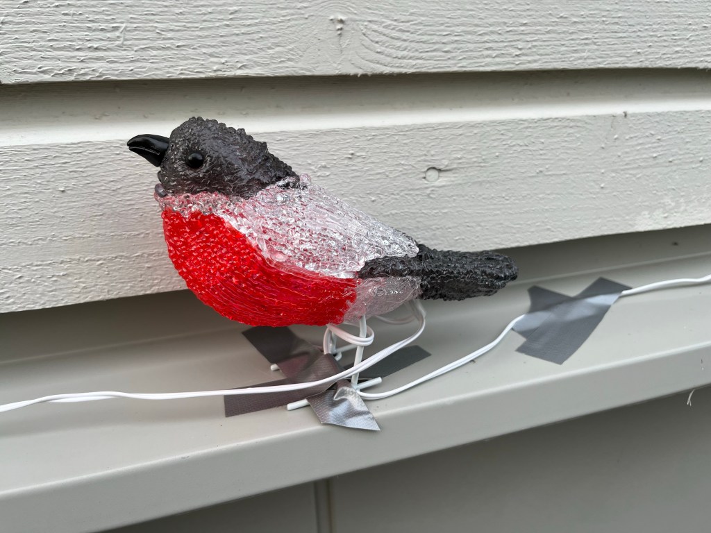 Nu lyser det fint på balkongen och vid entrén. Mina ljuvliga små domherrar är också på plats. Åh, vad det är mysigt!