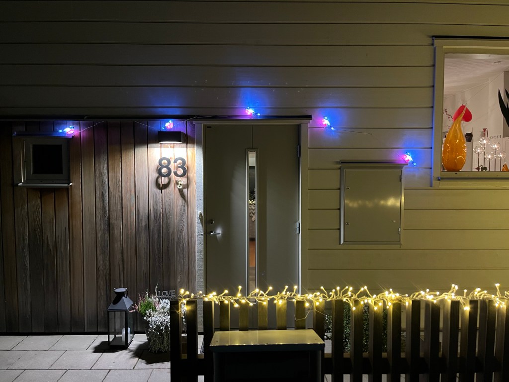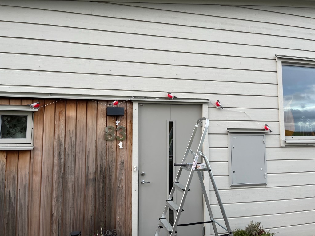 Det har varit ganska varmt utomhus och jag ville sätta upp utebelysningen innan kölden slår till vilket kommer att ske någon av de närmsta dagarna. Det är så jobbigt att knyta, tejpa och fixa med belysningen när det nästan är minusgrader. Mina fingrar gillar inte det.