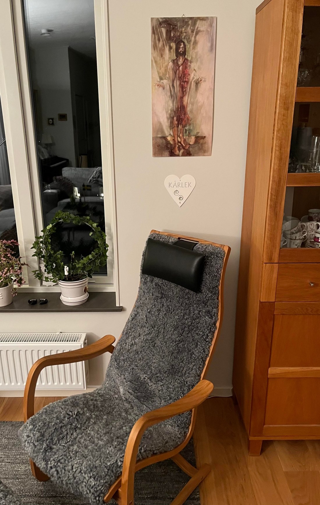 Ikväll har jag ändrat om lite bland mina tavlor och flyttat Jesus-postern till denna plats. Jag tycker den passar utmärkt här. Jag vill att detta ska vara en viloplats, en plats där Gud får tala och ge nya tankar och goda råd. Därför passar det att ha en bild på Jesus med sina utsträckta händer över fåtöljen. Jag vet att Gud kan tala till mig precis överallt men för mig har nu denna fåtölj blivit lite som en symbol för lyssnande. Här ska jag sitta och ta det lugnt och bara lyssna in Guds röst.