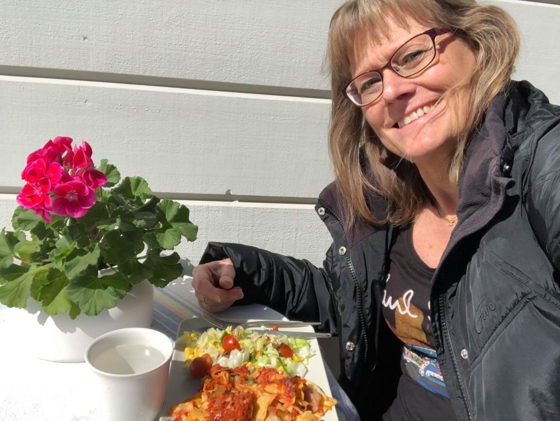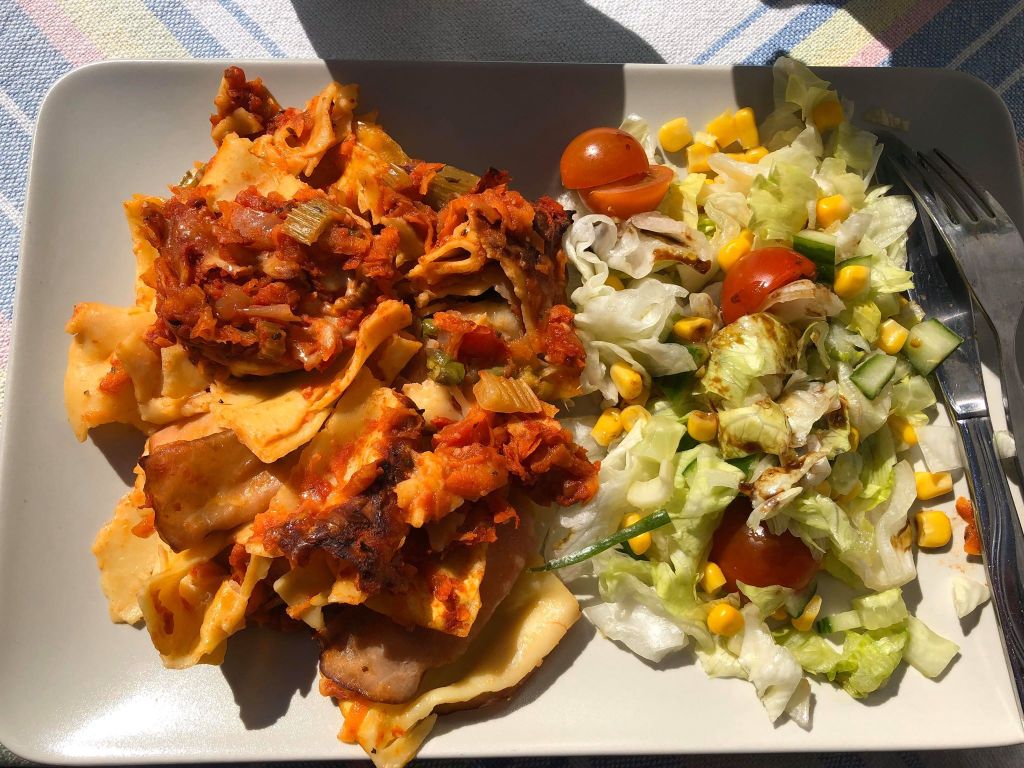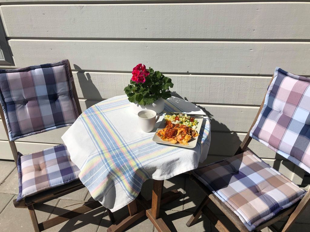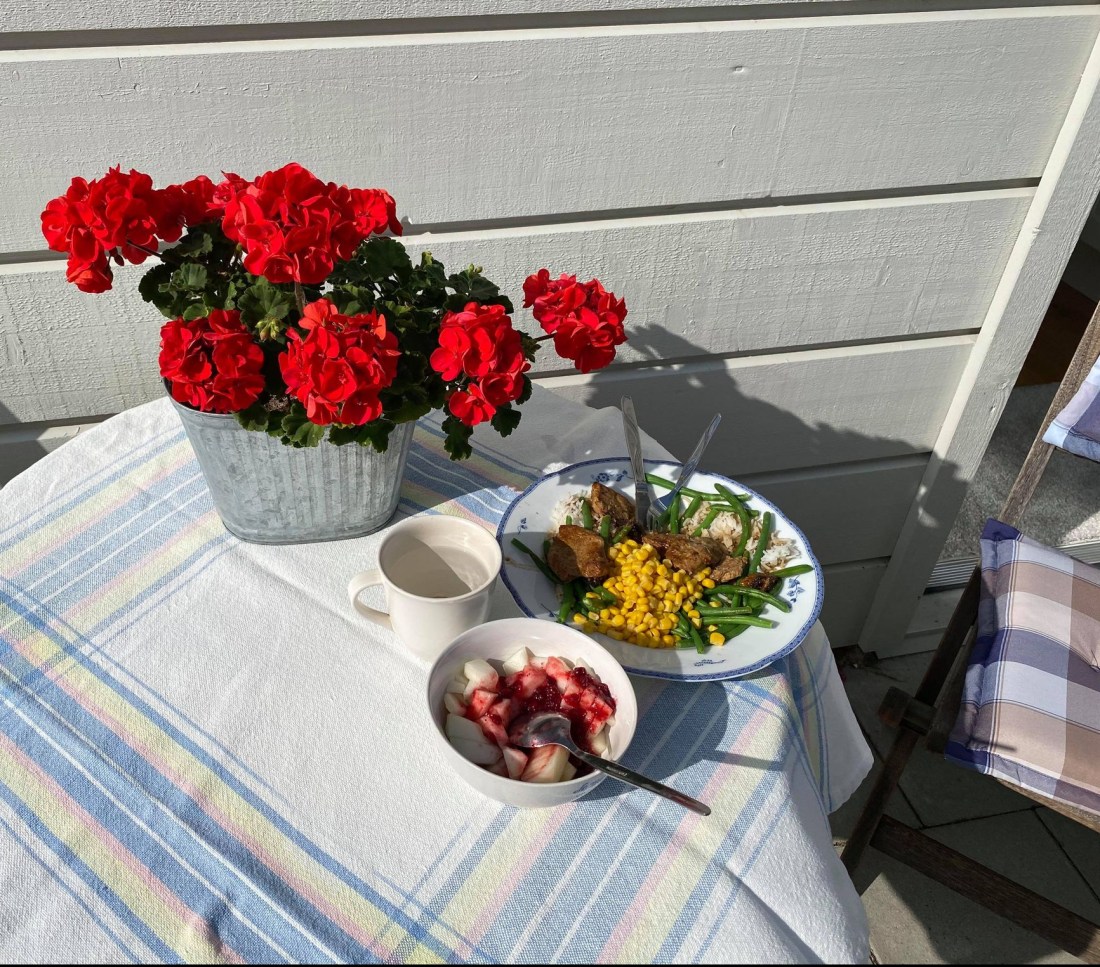 Jag arbetar mycket hemifrån nu och det har sina fördelar. Det är så varmt att jag kan luncha utomhus. Dock behövdes en jacka för det kom kalla vindar. Detta är något jag verkligen njuter av. Som man brukar säga – Små ting kan ge stor lycka. Det känns som att jag njuter av mycket nu: den gamla hemvävda duken jag vävde på 80-talet när jag gick på vävkurs, en god pastarätt som jag gjorde många portioner av för en tid sen (som än finns kvar att ta fram ur frysen), att sitta och skåda upp mot tallarna mitt under arbetsdagen. Livet har mycket att bjuda.