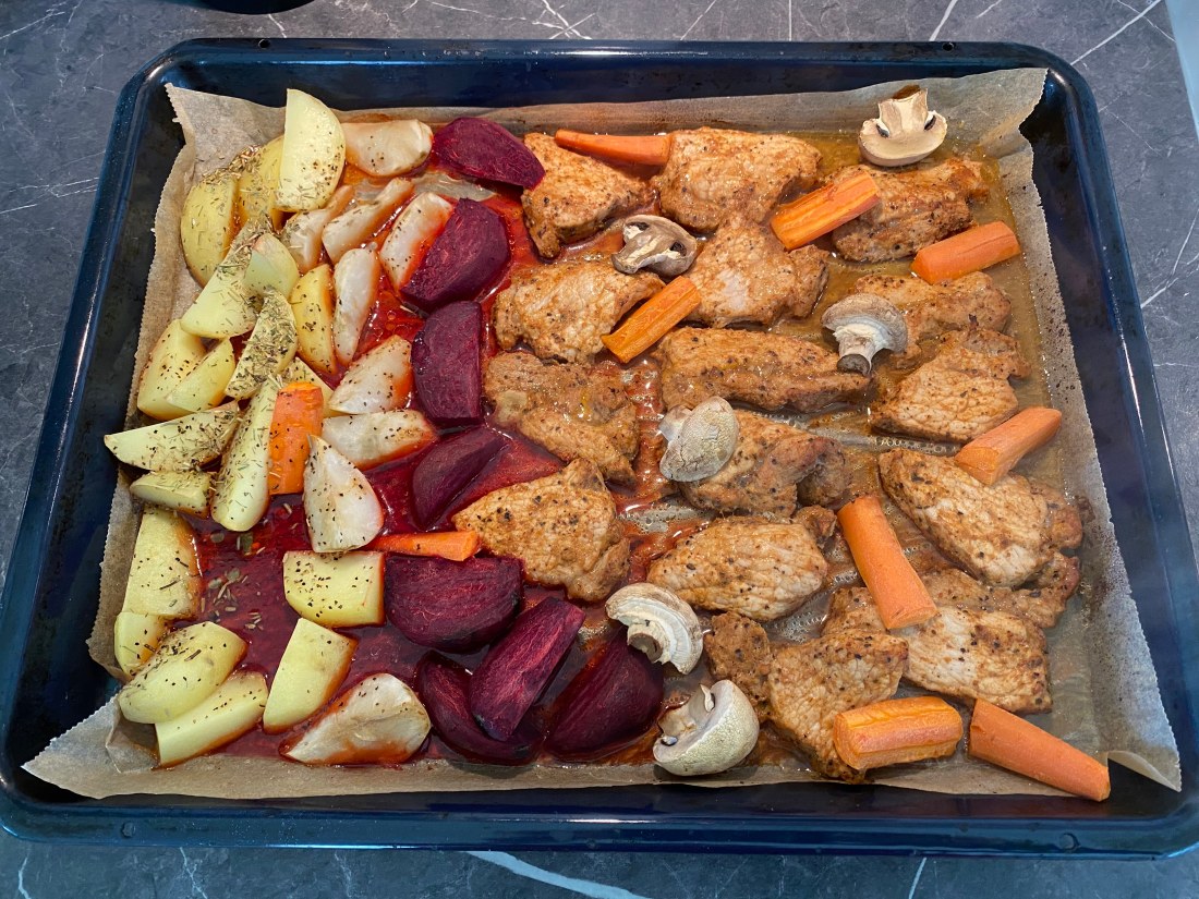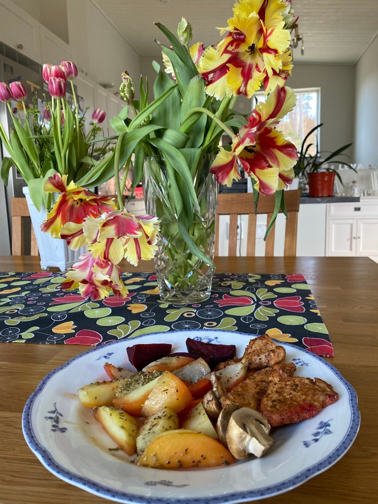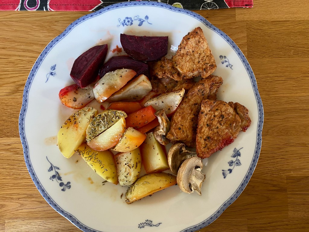 Jag slängde ihop en liten lunch! Det räcker nog några dagar. Lättlagat, nyttigt, gott och färgstarkt. Ugnsbakade potatisar, morötter, rödbetor, champinjoner och jordärtskockor. Det är första gången jag ugnsbakar jordärtskocka och det smakade mycket gott. Fläskytterfilén hade legat i marinad 1,5 dygn. Så enkelt egentligen men så gott! Mums!