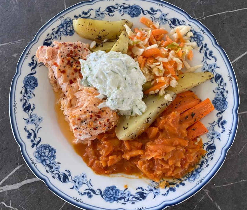 Igår förberedde jag lite mat för veckan. Dagens lunch blev nästan en liten buffé. Den innehåller följande: Klyftpotatis, morotsgryta med sting av chili och garam masala, tzatziki, veckosallad (bestående av vitkål, morötter och purjolök i lite vinäger, pyttelite rapsolja och pyttelite socker). Så hade jag färdig ugnsbakad lax att ta fram ur frysen. Jag åt och njöt.