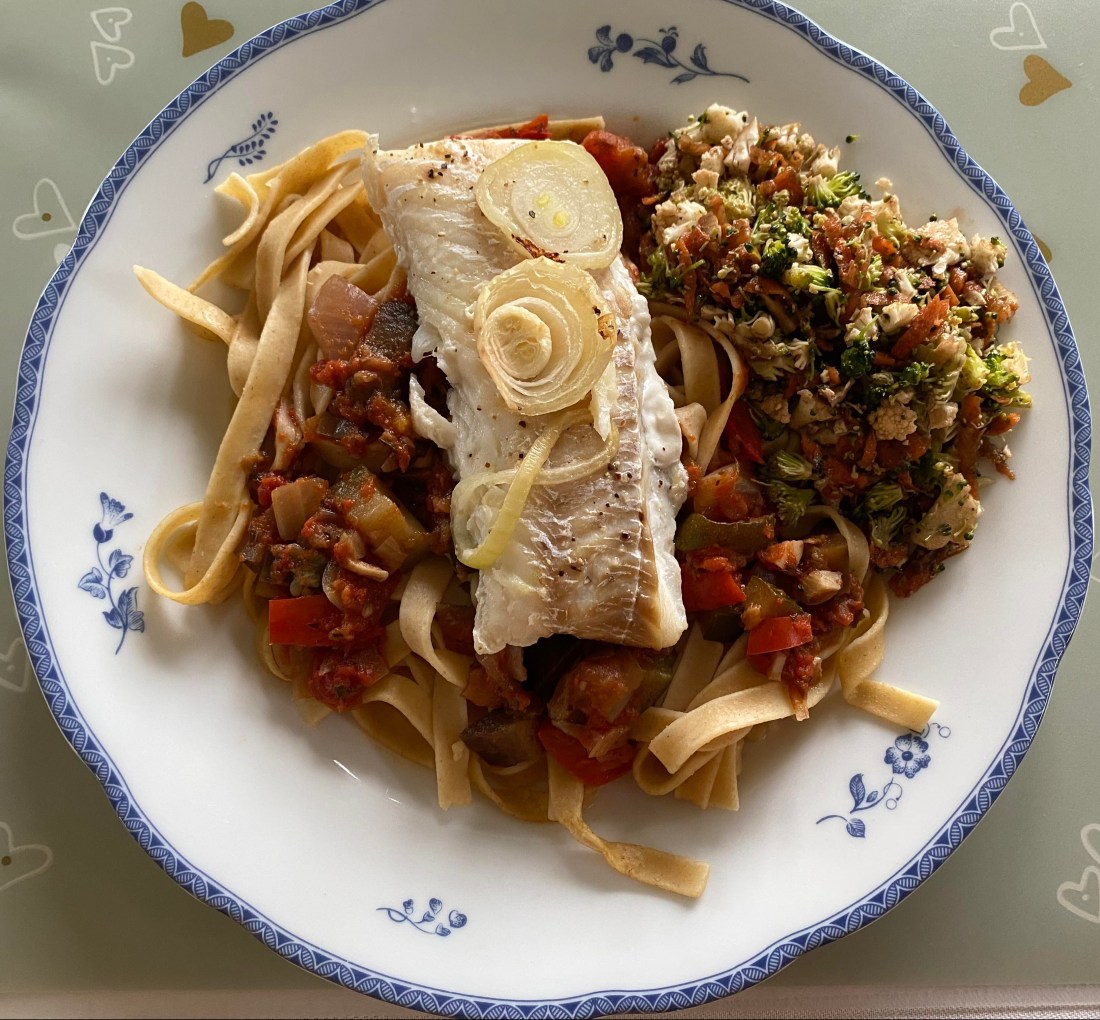 Jag tyckte att jag fick till dagens lunch här hemma riktigt vacker. Det är bara rester men jag tyckte det blev så inbjudande att det var värt ett foto. Följande finns på min tallrik: ugnsbakad torskrygg, fullkornstagliatelle, ratatouille samt en sallad med broccoli, blomkål och morötter. Gott och hälsosamt! Det sägs att vi är det vi äter så det gäller att boosta sig med en massa nyttigheter. Då är det okej om det även slinker ner lite onyttigheter då och då. Efter lunchen tog jag kaffe och en underbar mjuk kaka. Mums! Så bra jag har det!