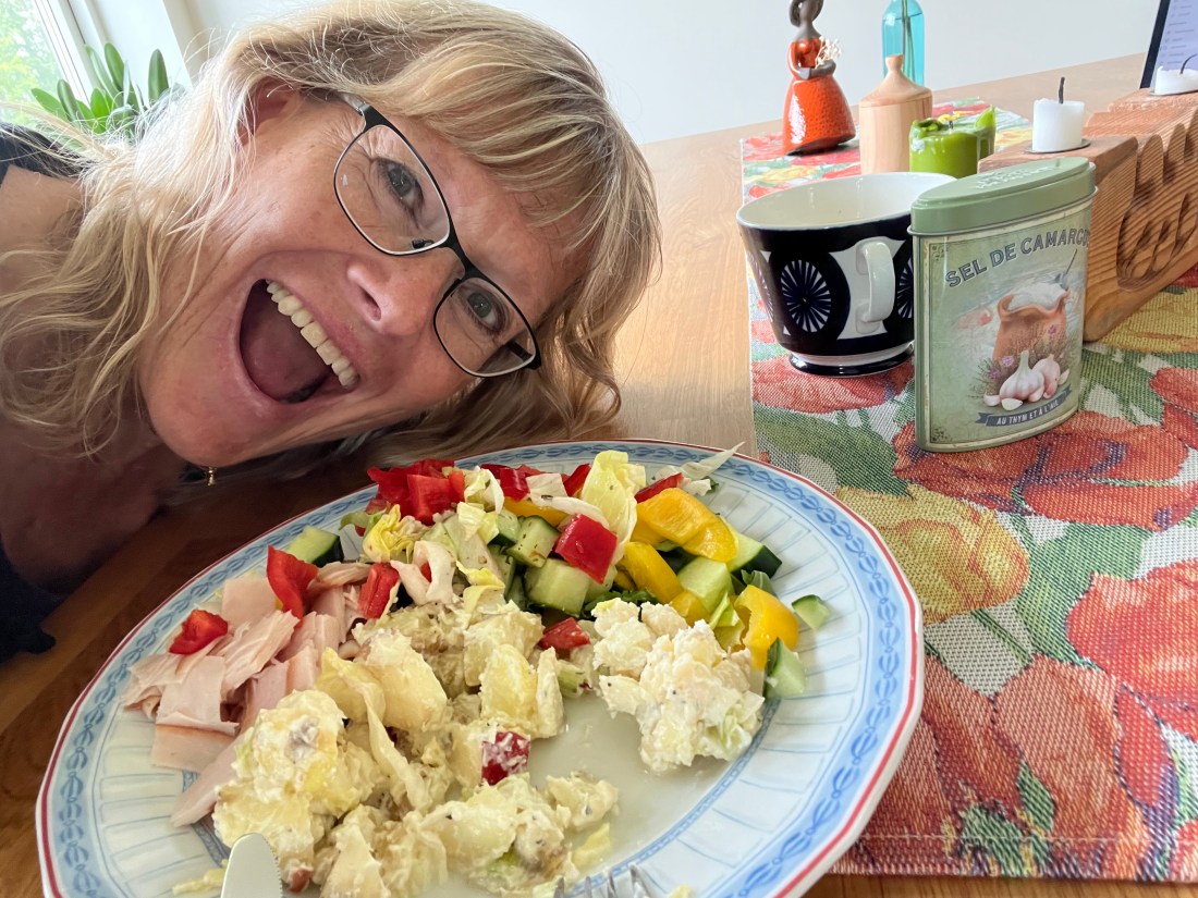 Jag brukar köpa potatissallad men eftersom jag tycker att den är alldeles för fet gör jag på mitt eget sätt. Jag kokar mycket potatis som jag skär i bitar. Så hackar jag purjolök och skär äpplen i bitar. Så blandar jag det med en del av potatissalladen och kryddar med salt och lite olika kryddor som kan variera från gång till gång. Vips har jag en potatissallad som faktiskt är ganska nyttig och jag tycker den är supergod. Med lite grönsaker och skivad kalkon till blir det ännu godare. Till efterrätt tog jag idag kaffe och ett par riktigt goda kakor. Mums! Då jämnar det ut sig med nyttigheterna.