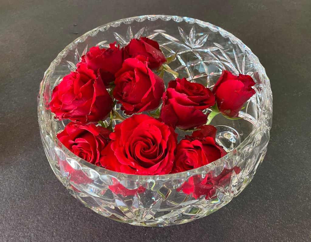 De nio röda rosorna flyter så vackert i en kristallskål och sprider glädje här inne.