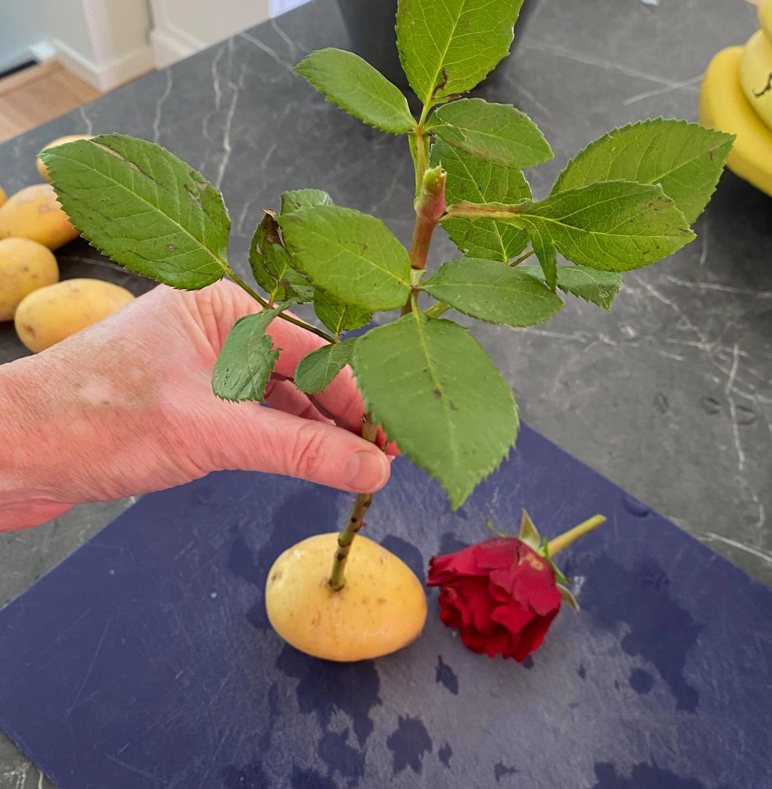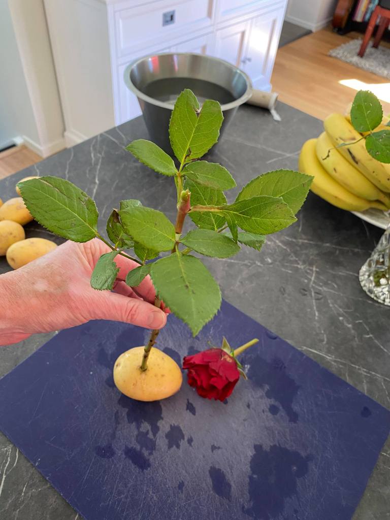 Den 29 maj testade jag en ny idé. Jag skulle odla rosor i potatis. Jag hade sett en film om detta på Youtube och ville testa själv. Potatisen som omgav stjälken skulle tillföra lagom med fukt och rötter skulle bildas så att man skulle få små plantor. Jag som älskar rosor tyckte att detta var perfekt.