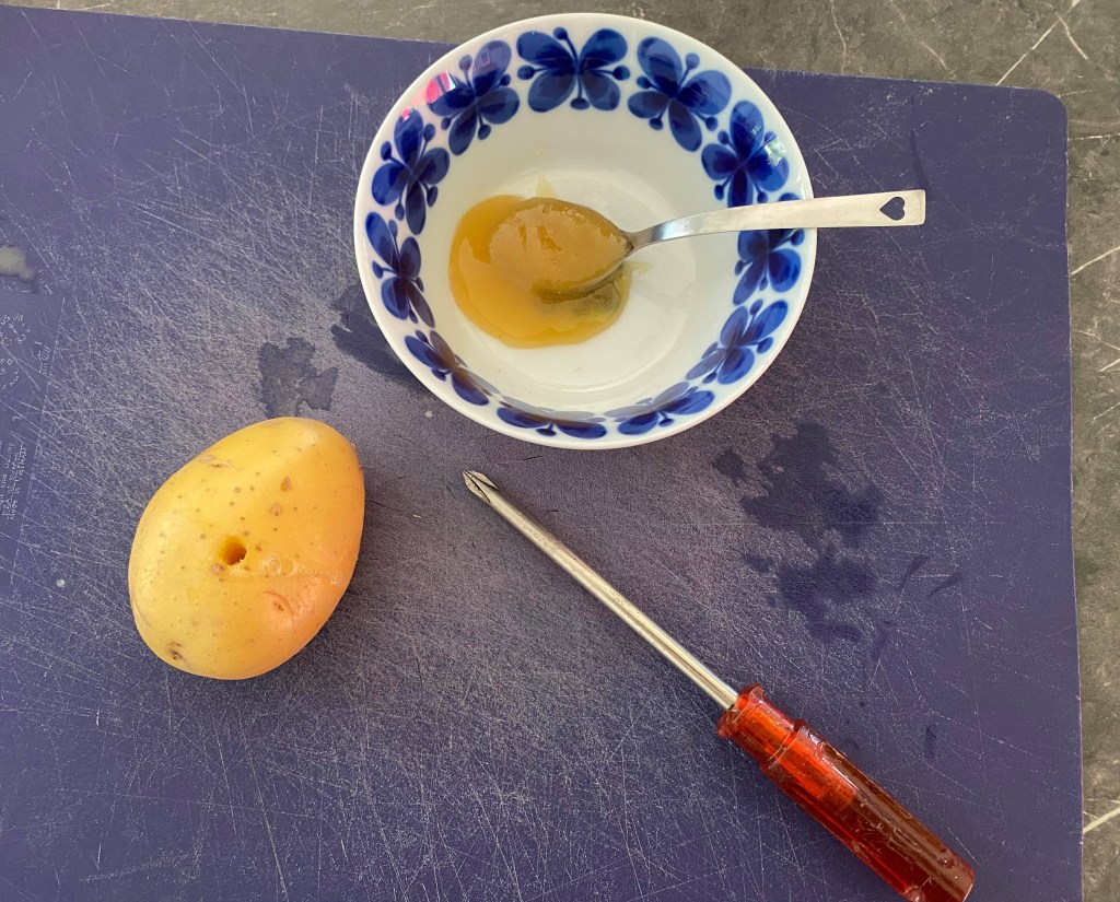 Idag köpte jag nio röda rosor och satte igång med projektet. Jag skar av rosorna några centimeter under blomman. Jag gjorde hål i potatisen med en skruvmejsel. Sen doppade jag stjälken i honung och petade ner den i potatisen.