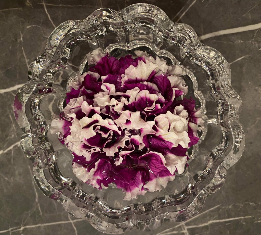 Ikväll har jag planterat dem här hemma och hoppas på mycket blomsterglädje. Det var inte helt enkelt att plantera dem för de var lite spretiga och några blommor gick av. Jag tog in en lila blomma och lade i en glasskål. Det blev dekorativt att ha inne också