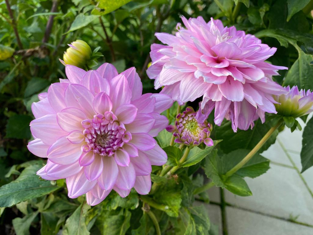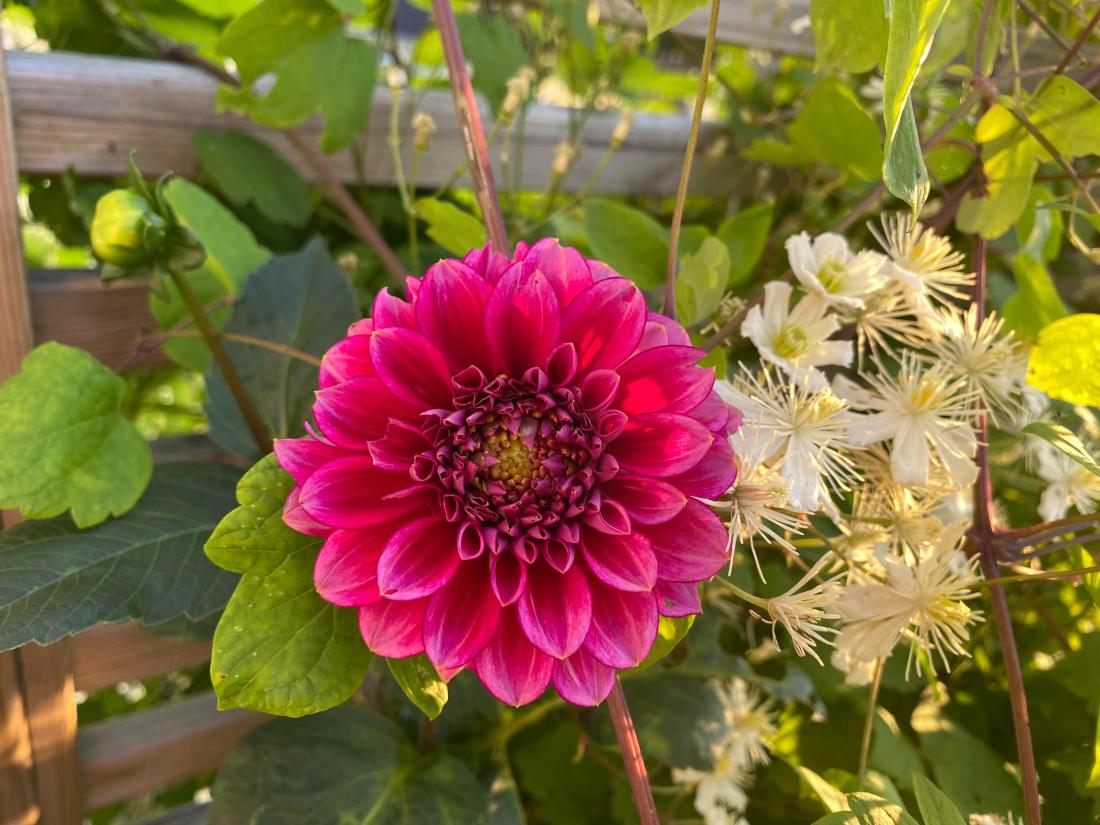 Nu börjar det bli fason på mina dahlior. Tillsammans med grannens vita slingrande växt som tar sig in till oss blir det jättefint. Nu njuter jag.