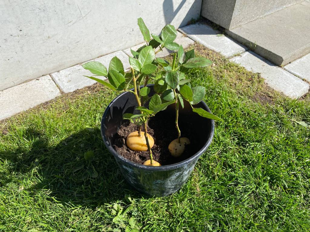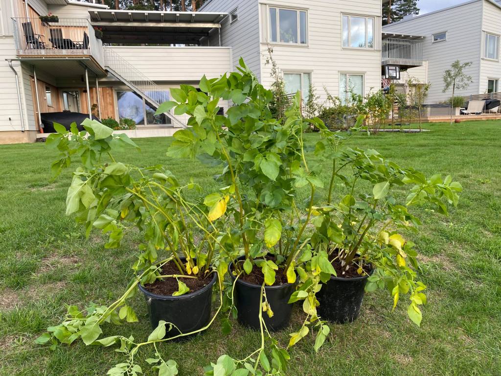 Efter en tid när jag kände på rosenstjälkarna var de lösa och jag kunde lätt dra upp dem ur potatisarna. Jag lät krukorna stå kvar ändå för det hade börjat växa upp potatisplantor. Idag, 81 dagar senare, har jag skördat. Det blev några potatisar. Jag hoppas de går att äta. En har legat för högt upp och fått för mycket solljus för den var grön. Jag slängde den för jag har lärt mig att gröna potatisar är giftiga. Wikipedia skriver följande: