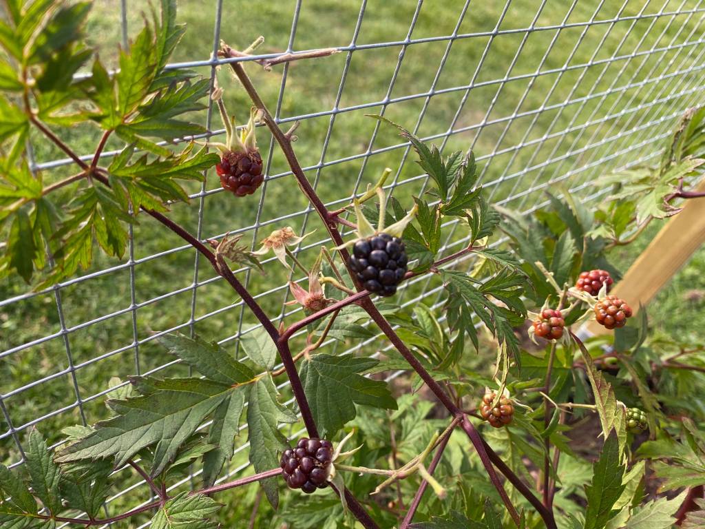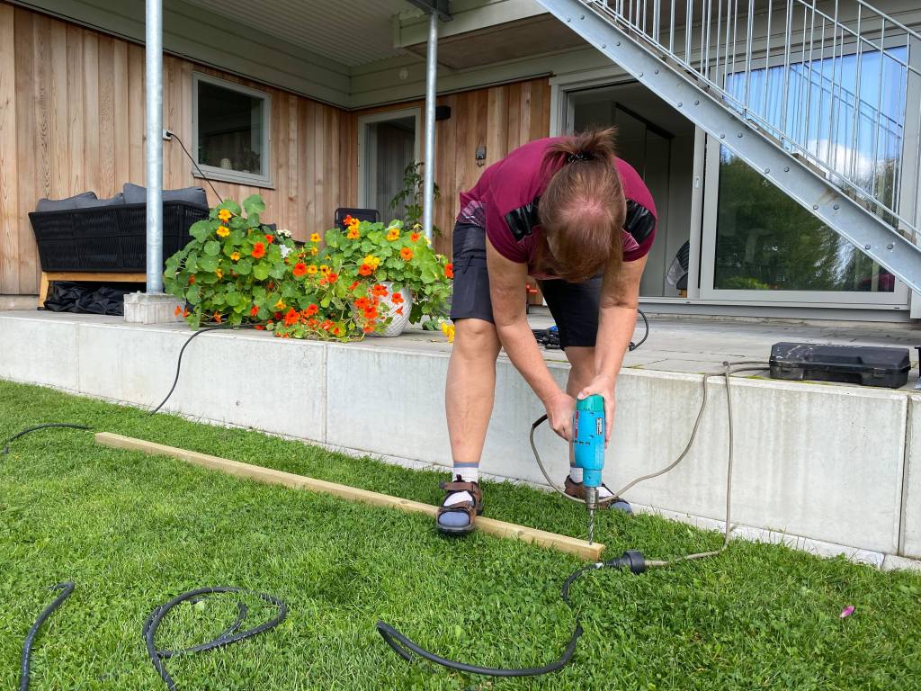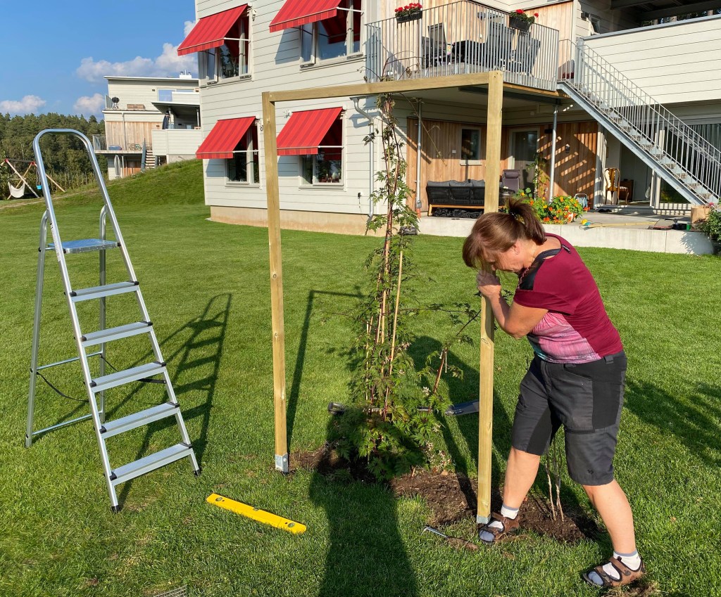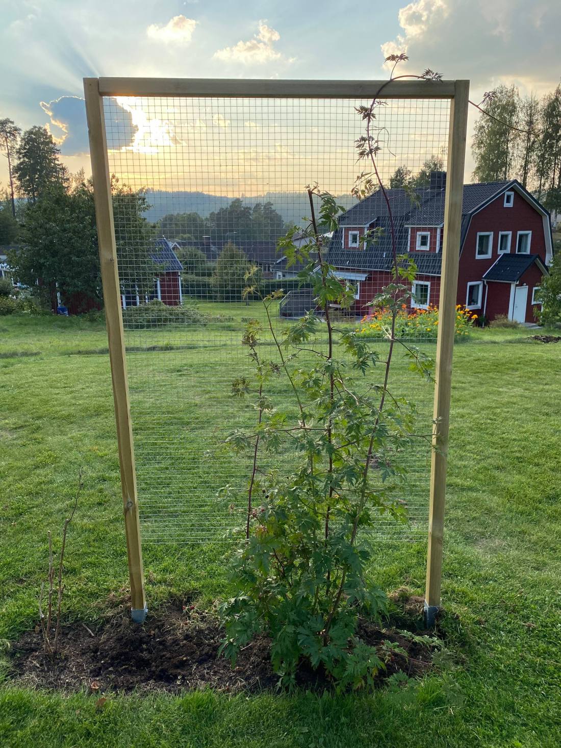 Min vän Kicki erbjöd sig att hjälpa mig att snickra ihop och sätta upp en spaljé till min björnbärsbuske som jag planterade i våras. Den har vuxit sig högre och högre. Jag har bundit upp den med pinnar men nu gick det inte längre. Jag hade köpt hem grejer från K-Rauta men hade inte klarat att göra detta själv. Kicki hade med en del utrustning också. Hon borrade hål i reglarna och jag fick den stora äran att med hjälp av mina nyinköpta franska träskruvar skruva fast varje regel i sitt jordankare. Ja, jag har lärt mig en del nya ord genom detta. Jag hade ingen aning om vad varken jordankare eller franska träskruvar var men nu vet jag bättre. Det gick jättelätt att skruva fast skruvarna med hjälp av en hylsnyckel…tror jag det heter.