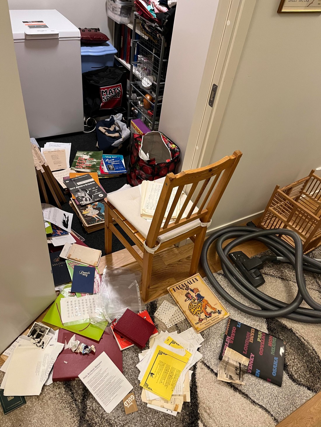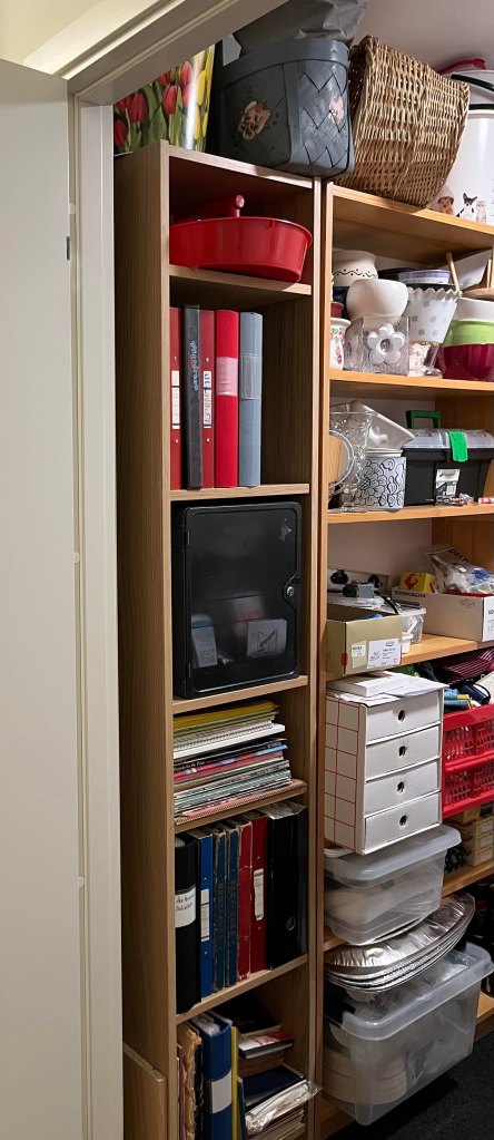 Så här ser det ut i förrådet. Det är alltså den vänstra smala bokhyllan som är ny. Nu finns här pärmar med sånger och noter, sångböcker och annat smått och gott. Jag älskar ordning och reda…även om allt kanske inte ser så ordningsamt ut.