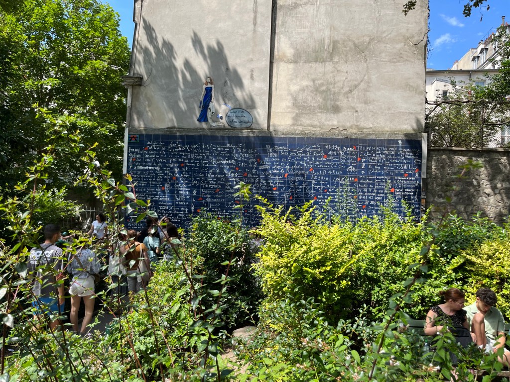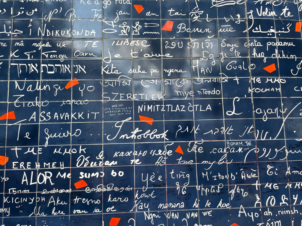 Jag fick se på Google Maps att det finns ett monument som heter Kärleksmuren. På franska heter den Le mur des je t’aime. Jag hade inte hört talas om den muren tidigare men ville förstås gå dit för att se vad det var. Det visade sig vara en mur med orden Jag älskar dig skrivet på en mängd olika språk. Jag läser på murens hemsida att orden Jag älskar dig är skrivet 1000 gånger på mer än 300 språk. Så vackert! Murar finns för att skilja folk åt men här är det en mur som förenar människor. Den ligger så vackert på en fin liten innergård.