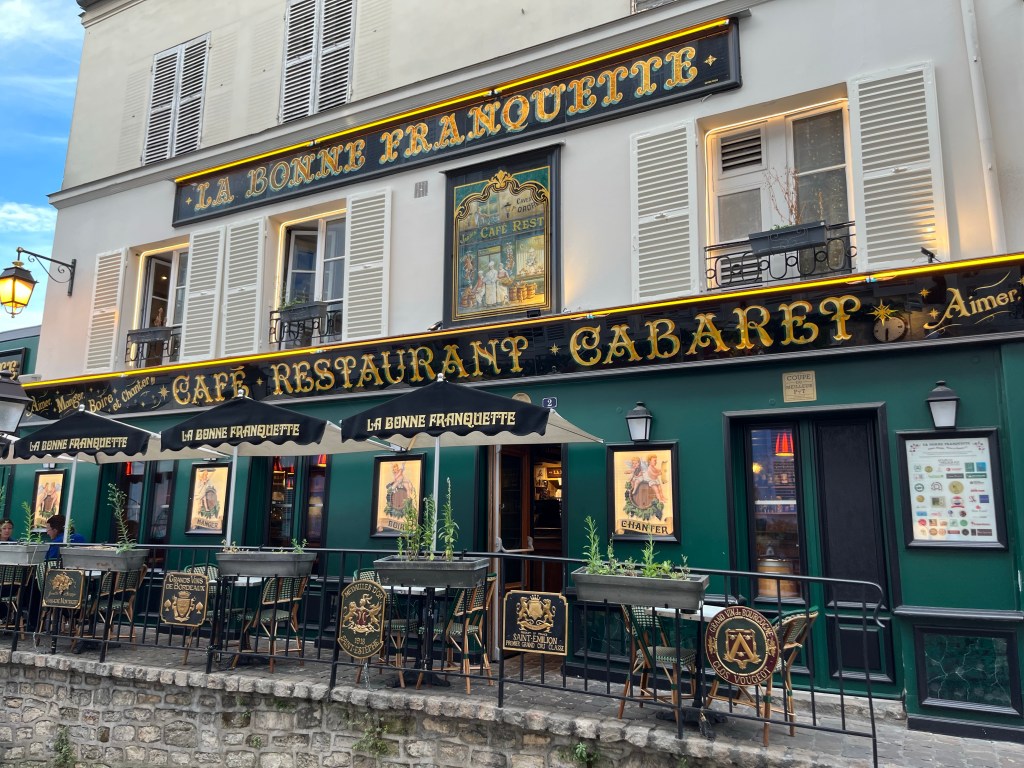 Jag drack en kopp kaffe på La Bonne Franquette, en restaurang som vi besöker med våra gäster då vi har utflykt med Scandorama till Montmartre. En glad kväll i Montmartre heter utflykten och det brukar bli en glad och trevlig kväll då vi bl a intar en trerätters middag här. Jag satt ute på terassen och inmundigade mitt kaffe och vilade ganska länge. Jag satt och läste om Paris och bara kände välbehag.