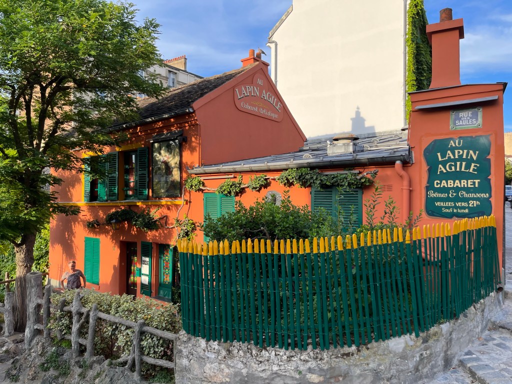 Här ser vi kabarékrogen Lapin Agile. Den räknades till en av Paris kända nöjeskrogar i början av 1900-talet. Här kunde man få se och höra kända franska ”chanson-artister”. Det var då också ett stamställe för de berömda konstnärerna som bodde och verkade i Montmartre. Här satt ofta Picasso och Utrillo. I dag fungerar Lapin Agile mer som en jazzklubb.