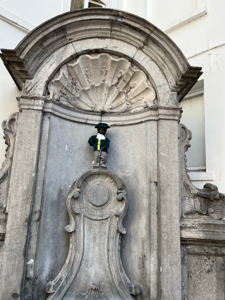 Vi gick vidare till Manneken Pis som hade en svart dräkt på sig idag.