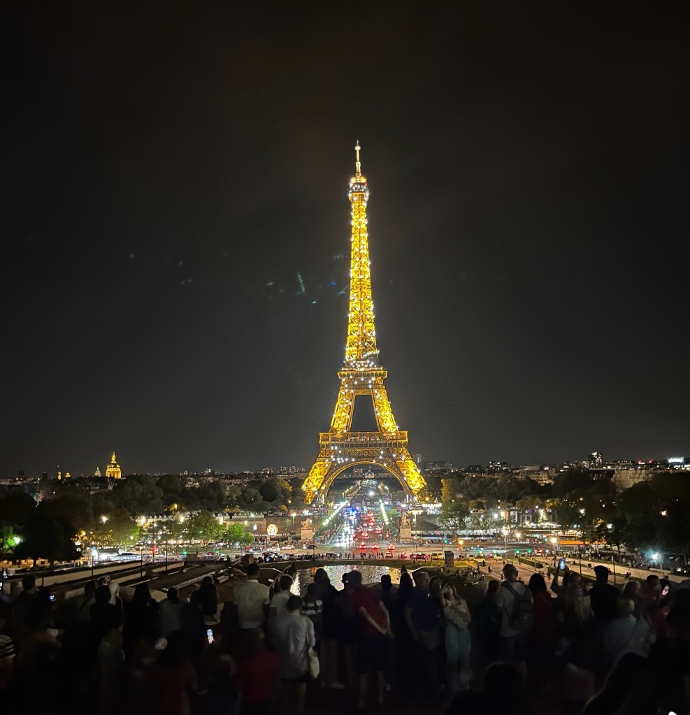 Vi fortsatte sen vidare till Paris. När vi checkat in var det dags för första utflykten som heter ”Se Paris Glittra”. Vi åt först en trerätters middag på en närliggande restaurang och sen bar det iväg på stadsrundtur i natten. Vi stannade till vid Eiffeltornet där alla fick gå ut för att se när tornet blinkade. Eiffeltornet blinkar varje hel timme efter mörkrets inbrott. Ljusshowen pågår i fem minuter.