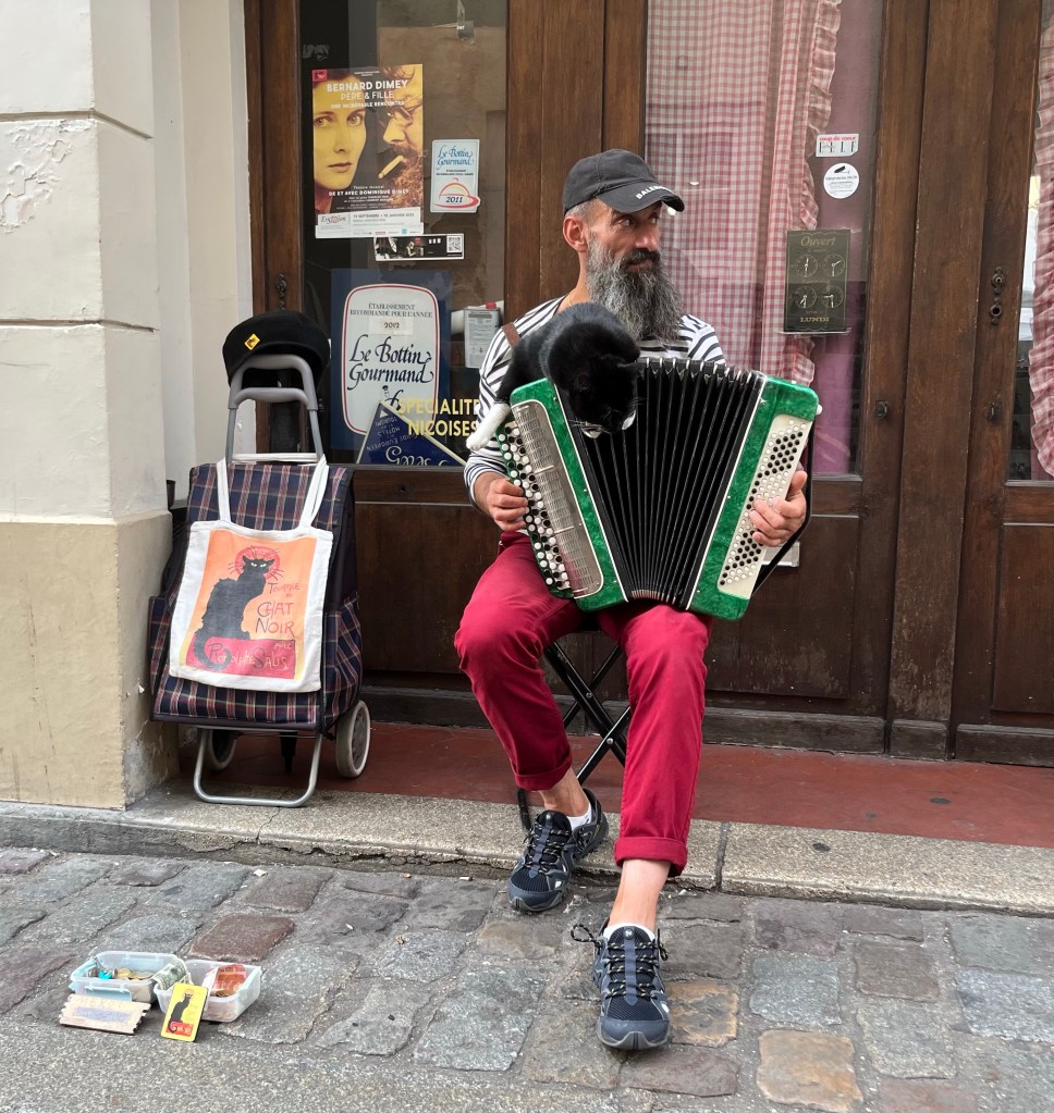 Vi strosade runt vid Place du Tertre och på gatorna intill. Katten satt på denna musikants dragspel och verkade njuta av musiken.