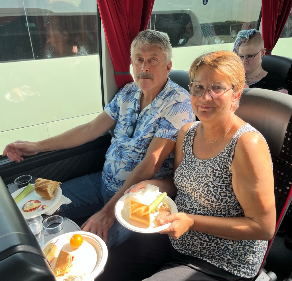 Många satte sig inne i bussen och åt för det var varmt ute men i bussen har vi air condition.