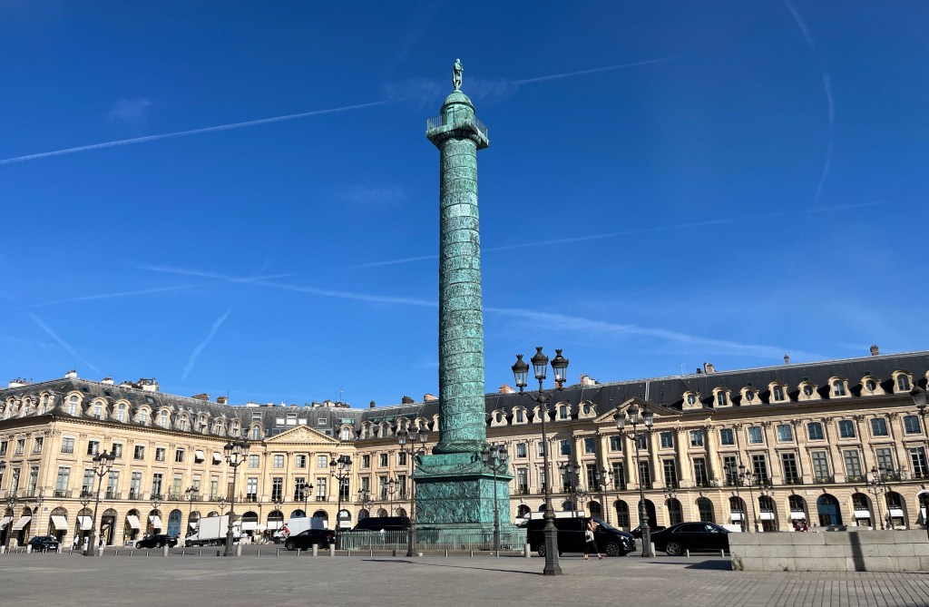 I mitten ser vi Colonne Vendôme – Vendômekolonnen. Det är en 44 meter hög bronsstaty med Napoleon högst upp. Den är gjord av 1200 nedsmälta kanoner. På den slingriga bronsreliefen skildras Napoleons arméers bragder. Monumentet restes 1806 på order av Napoleon för att fira segern vid Austerlitz. Kolonnen revs i samband med Pariskommunen 1871 men återställdes 1874 med en kopia av originalstatyn i dess ställe.