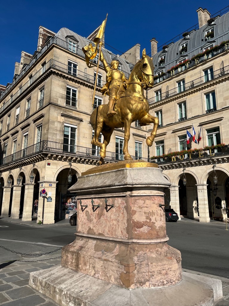 Jag fortsatte min promenad förbi en staty av Jeanne d’Arc som är Frankrikes nationalhelgon. Jeanne var en vanlig flicka som hjälpte till i hushållet och vaktade familjens boskap. Något hände när hon var tolv år. Hon började höra röster. Själv hävdade hon hela sitt korta liv att rösterna kom från Gud. Rösterna uppmanade henne att befria landet från engelsmännen. Först när hon var 17 år bestämde hon sig för att följa uppmaningen.