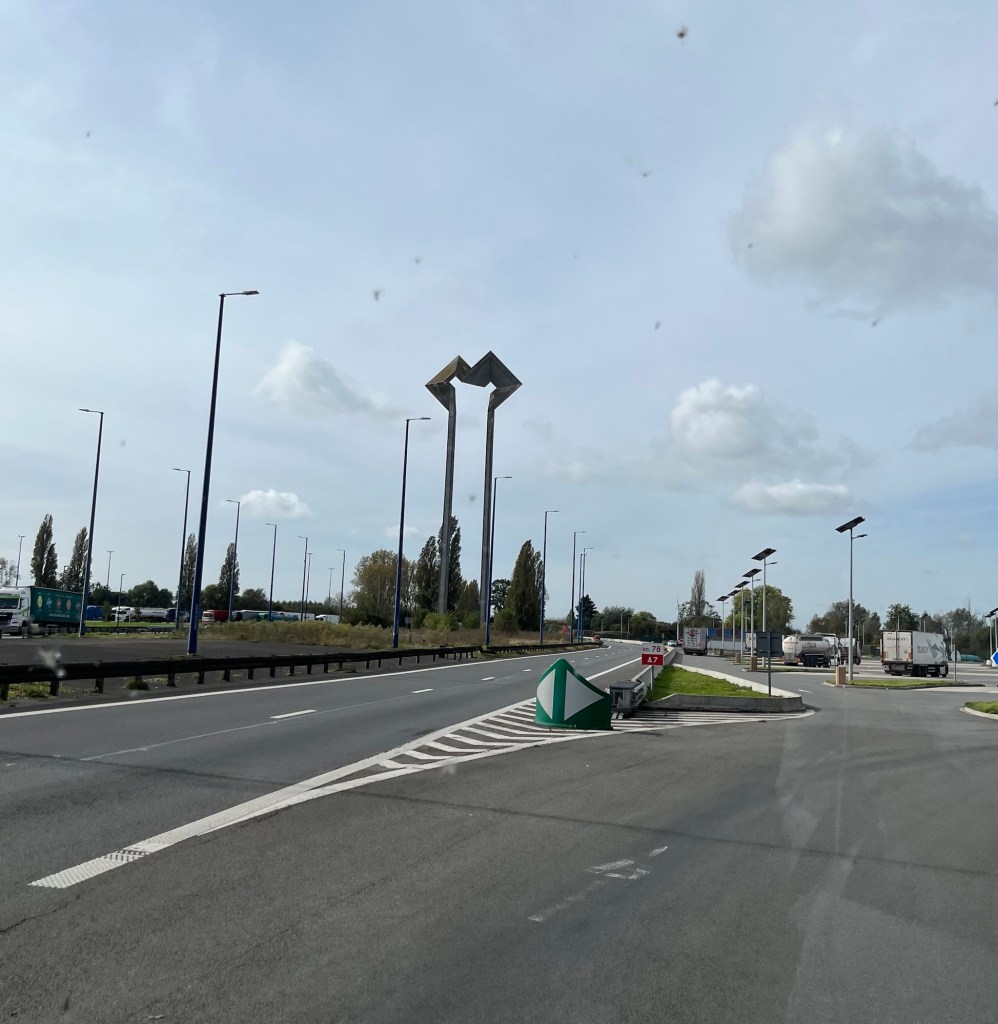 Idag lämnade vi Wuppertal och styrde kosan mot Paris. Vi körde genom Belgien och passerade gränsen till Frankrike vid detta monument som heter Monument Signal d’Hensies de Moeschal. Det uppfördes 1972 och är designat av Jacques Moeschal. Det symboliserar vänskapen mellan Belgien och Frankrike. Det ligger vid motorvägen A2/E19.