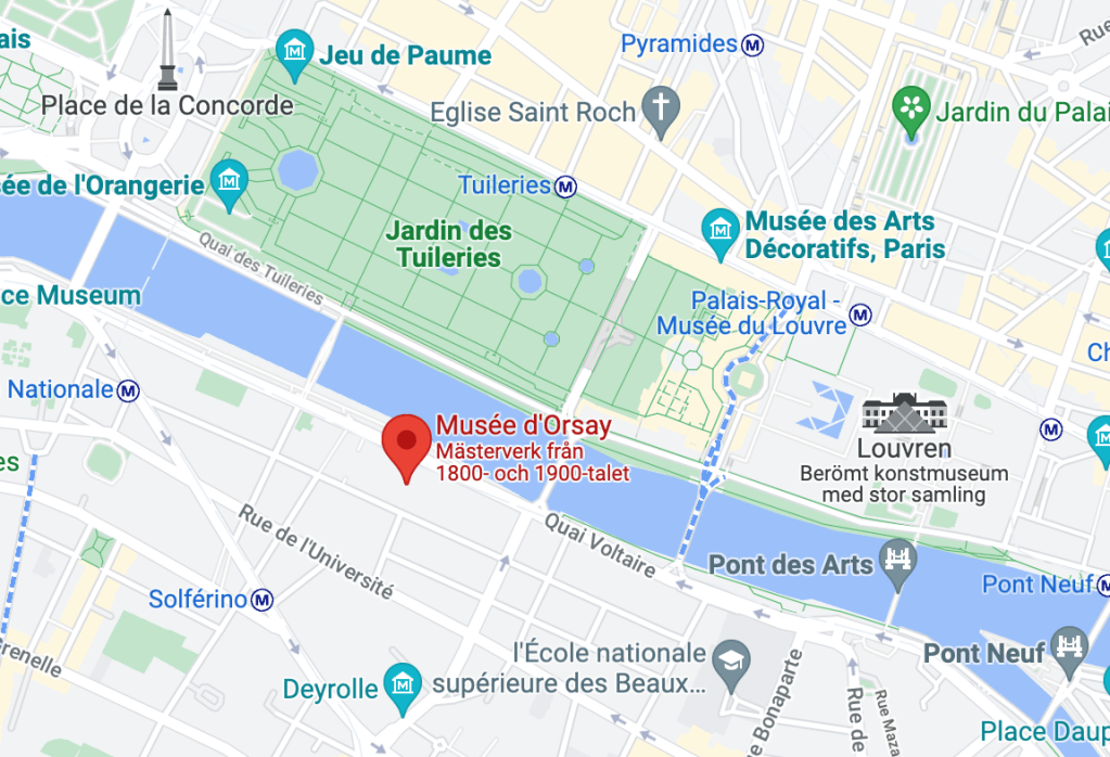 Sommaren 2003 besökte jag konstmuseet Musée d’Orsay för första gången. Det är ett konstmuseum som invigdes 1986 och är inrymt i en gammal järnvägsstation, Gare d’Orsay, och ligger centralt i Paris på vänstra stranden av floden Seine. Det ligger mitt emot Jardin des Tuileries (Tuileriträdgården) i anslutning till Louvren. Kartan nedan är hämtad från Google Maps.