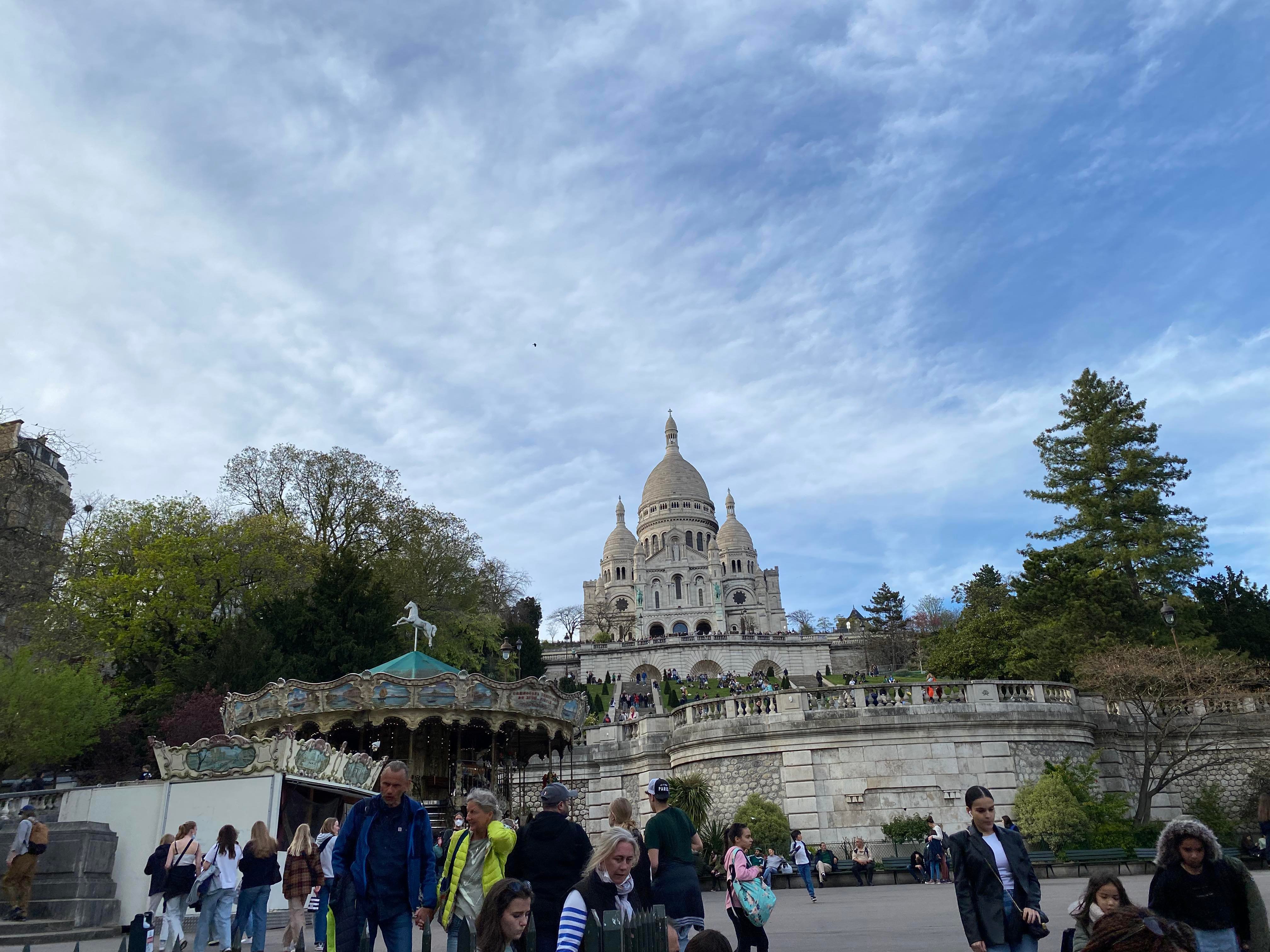 Vi hann hem en liten stund innan det var dags för dagens tredje utflykt – En glad kväll i Montmartre. Kl 18.00 åkte vi upp till Montmartre där vi började med att gå uppåt mot Sacré-Coeur. En del gick hela vägen upp men många av oss åkte med Le Funiculaire som är en bergbana. Väl uppe på Montmartrekullen har man en fantastisk vy ut över Paris. Vi gick in i Sacré-Coeur en liten stund innan vi gick vidare upp till Place du Tertre. Det är ett torg där Paris målare sitter och målar och gör porträtt av människor som önskar det. Jag älskar denna plats. Det är så mysigt och det är fullt av butiker, restauranger och caféer.