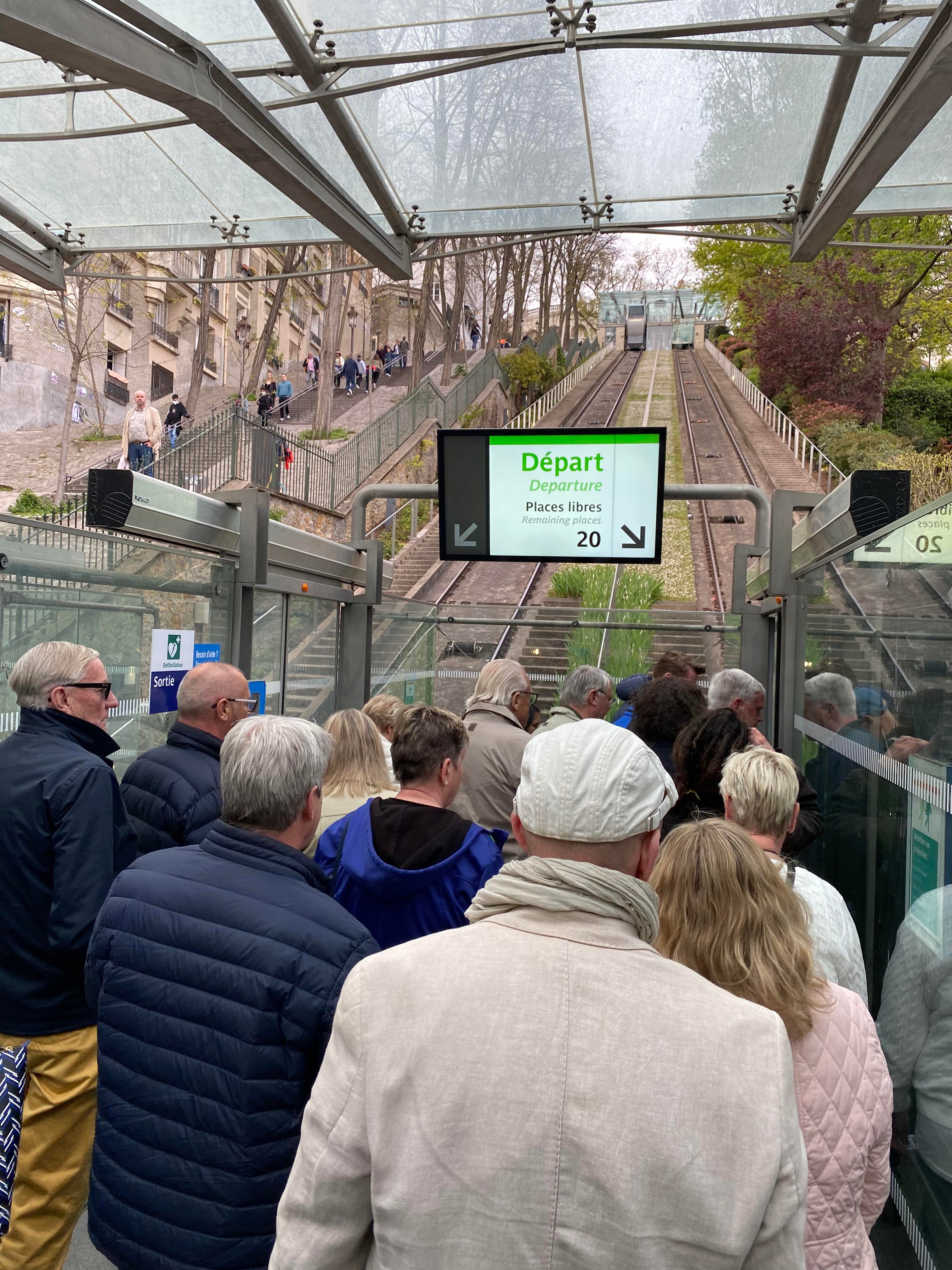 Kl 18.00 åkte vi med bussen upp till Montmartre. När jag är själv brukar jag gå uppför alla trappor till Sacré-Cœur men ikväll åkte vi med bergbanan, le funiculaire.
