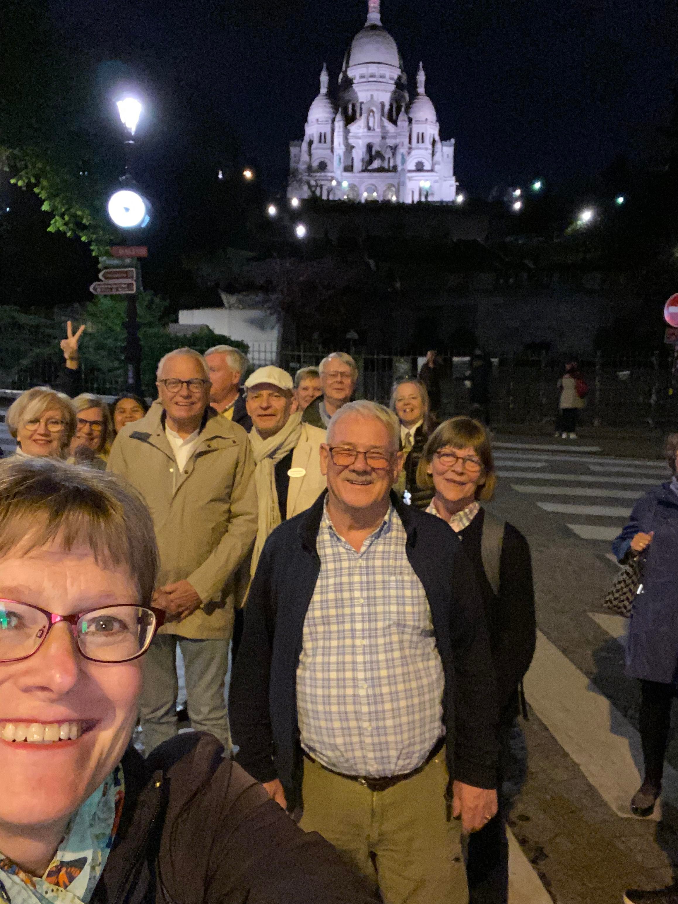 Kl. 18.00 var det dags för kvällsutflykten En glad kväll i Montmartre. Micke släppte av oss vid métrostationen Anvers och vi gick sen uppför den smala gatan mot Sacré-Cœur. En del av gruppen poserar här glatt nedanför kyrkan.
