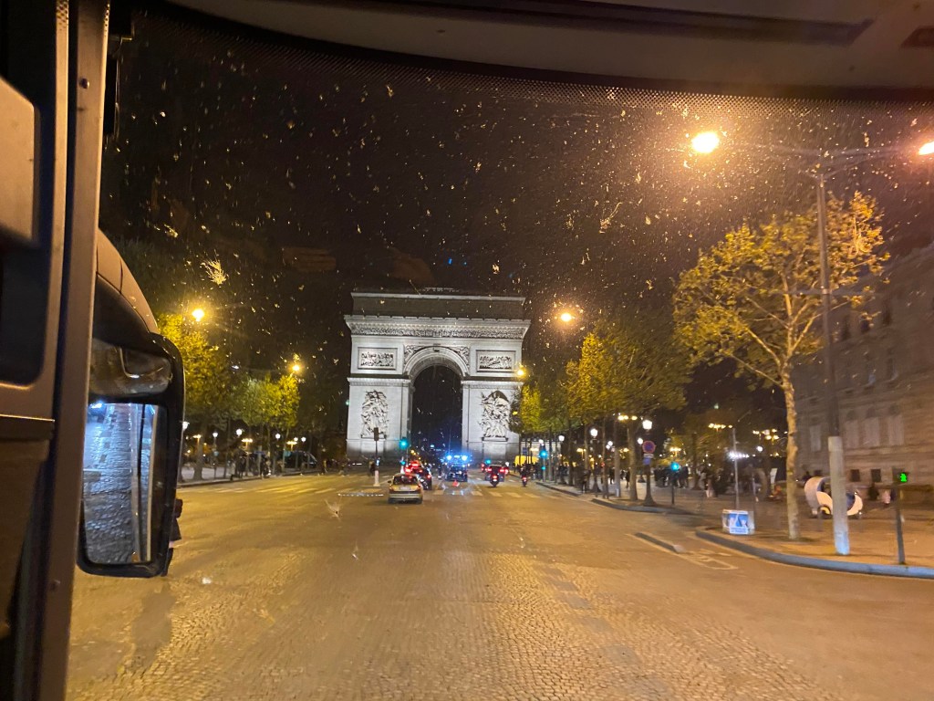 Sen kom Bernard, en fransk chaufför som vi hyr in första kvällen eftersom vår egen chaufför kört hela dagen och behöver vila. Vi skulle ut och se Paris glittra. Vi åkte via Place Vendôme som är ett av de lyxigaste kvarteren och vidare mot Champs-Élysées. Vi åkte sakta uppför den 2 km pampiga paradgatan. Jag spelade Frankrikes nationalsång La Marseillaise och låten Oh, Champs-Élysées med Joe Dassin. Det blev riktigt stämningsfullt och resenärerna filmade. Det fanns en hel del att berätta också. Den 12-filiga rondellen runt Triumfbågen väcker uppmärksamhet. Högerregeln gäller så den som ska in i rondellen har förtur samtidigt som inga filer är utmärkta utan alla kör huller om buller. På något konstigt sätt fungerar det.