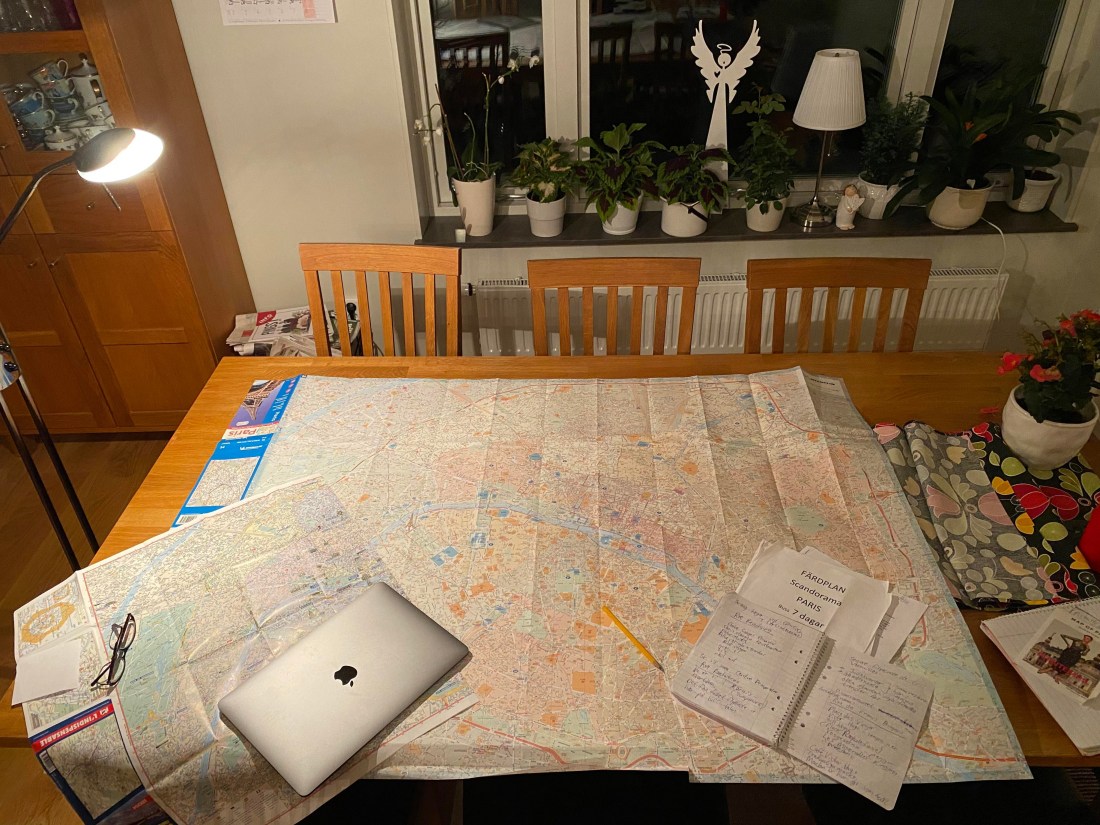 Under hela resan till och från Paris samt vid alla utflykter hade jag som uppgift att skriva färdplan. Tillsammans med reseledare Joakim och busschaufför Åsa gick det jättebra. Jag antecknade febrilt hela tiden. Jag hade några saker kvar att göra här hemma innan jag skulle skicka in den. Stadsrundturen på fyra timmar skulle jag skriva ner och även hur vi tog oss till och från de olika utflyktsmålen i Giverny, Versailles m.m. Jag beställde en Michelin-karta över Paris förra veckan . Den är detaljerad och de enkelriktade gatorna finns med. Med hjälp av den har jag nu gjort allt klart. Det är en hel del arbete men det är jätteroligt. Jag älskar Paris och då är det bara intressant när jag får sitta och grotta ner mig i de olika gatorna.