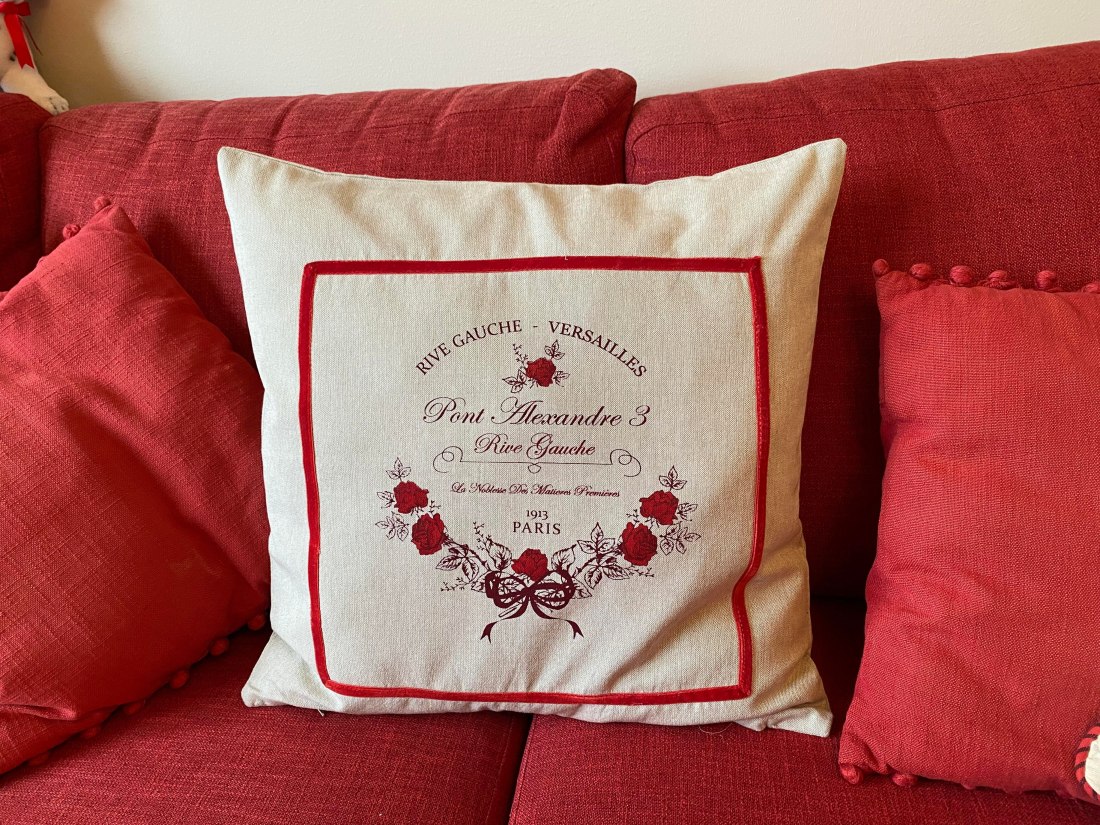 När mina Frankrikekompisar var här för någon vecka sen var vi ute och shoppade på lördagen. De andra shoppade kläder och fyndade skor men jag hittade nästan ingenting. Det enda jag köpte var ett kuddfodral som var på rea. Jag tyckte det var snyggt och tänkte att det skulle passa bra i min röda soffa. Nu är det struket och en kudde är placerad inuti. Jag tycker det blev jättebra.