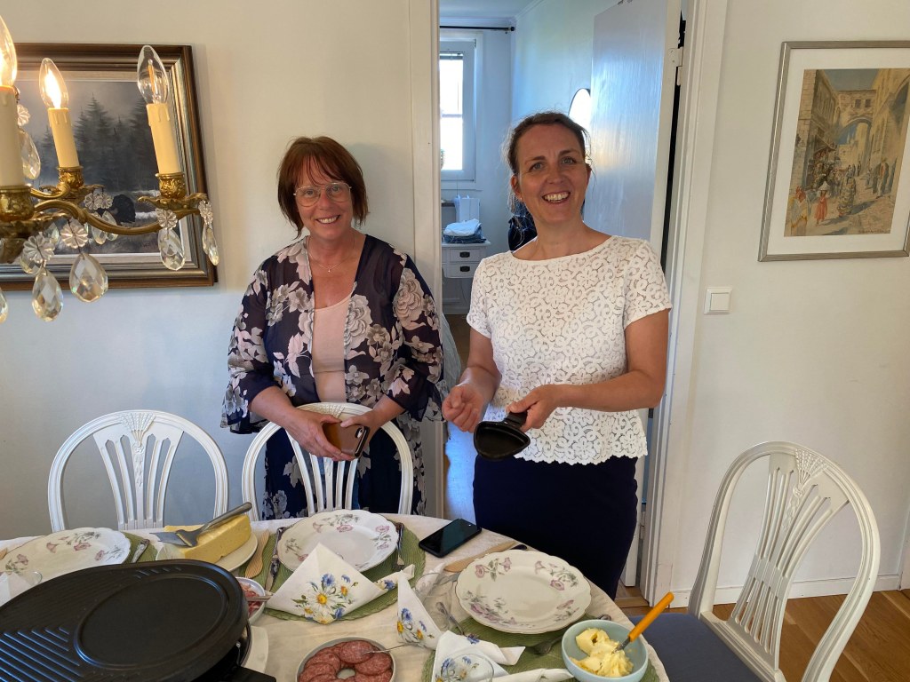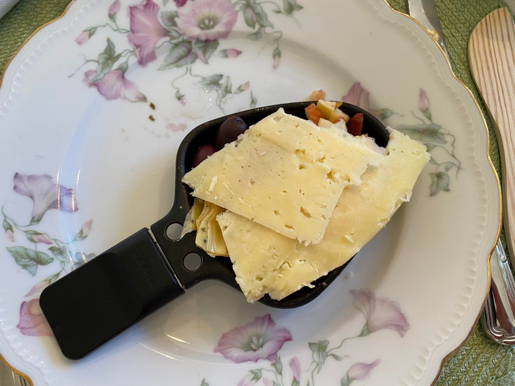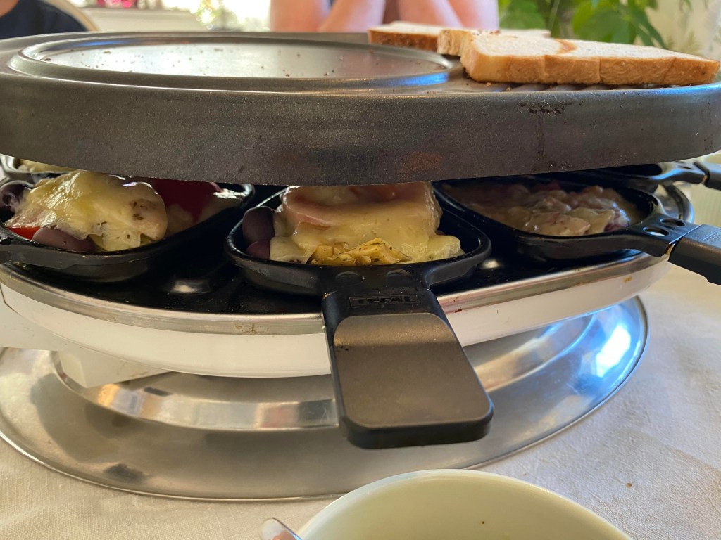 Min goda vän Susanna hade bjudit in till Parisafton ikväll. Hon bjöd på raclette. För dig som inte ätit det kan jag berätta att var och en ”lagar sin egen mat”. Alla får varsin liten ”stekpanna” där man lägger de ingredienser man vill ha. Susanna bjöd på bacon, salami, champinjoner, tomater, syltlök, cornichons (små inlagda gurkor), äppelbitar, oliver, rödlök, inlagd kronärtskocka och ost som läggs överst. När man lagt det man vill ha i stekpannan sticker man in den under plattan så att maten får lagas. Under tiden lägger man en franskbrödskiva ovanpå raclettegrillan så att den rostas. Sen när allt är klart på stekpannan skrapar man ur det med en smörkniv el dyl och lägger det på den rostade macken. Sen fortsätter man med denna procedur tills man är mätt.