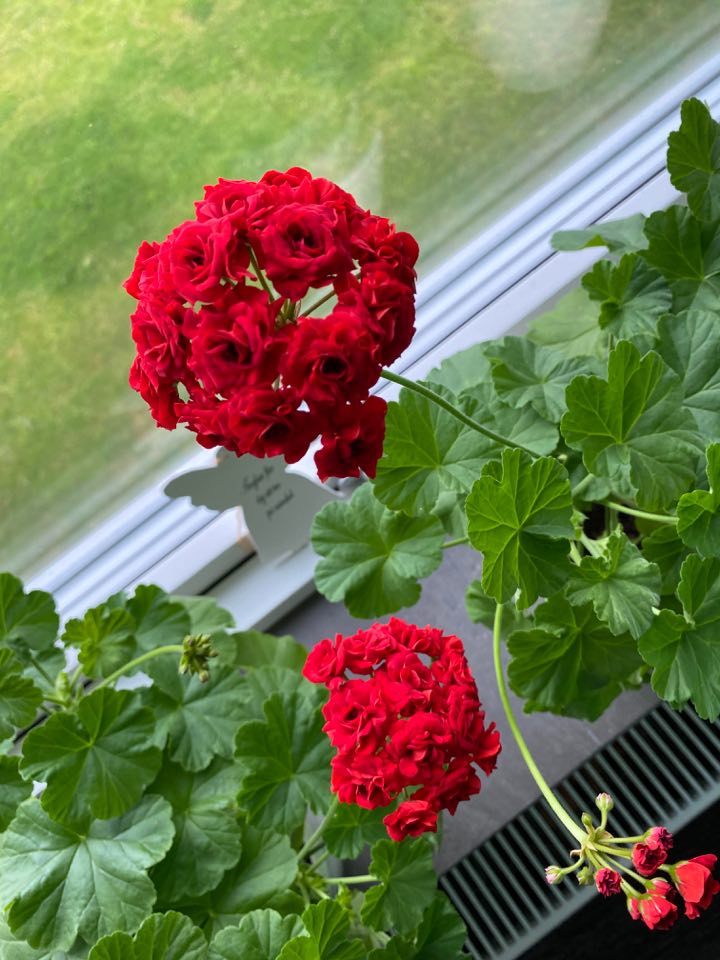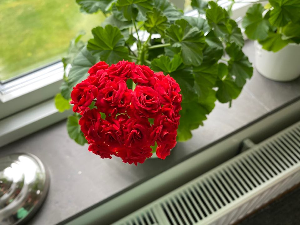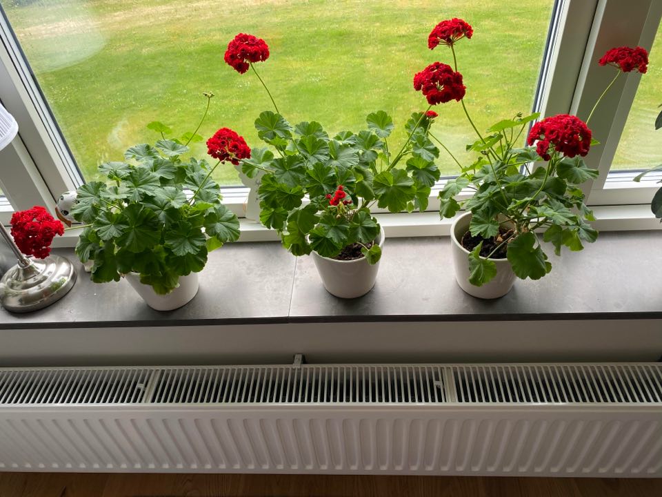 Palettbladen har fått helt underbara färger av solljuset. Den lilla planterade jag av några telningar häromdagen så den har inte börjat växa till sig än. Pelargonerna blommar mer och mer. Härligt!
