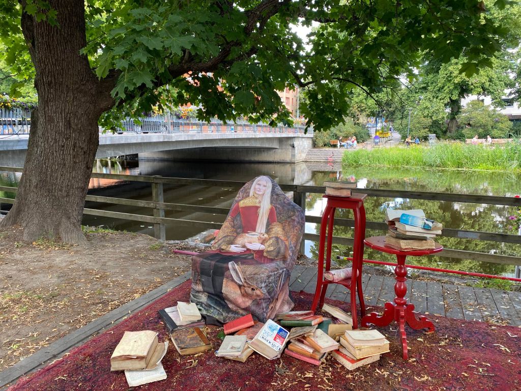 Jag var inne i Litteraturens hus där Uppsala Författarsällskap håller till. Den vackra konsten nedan fanns i trädgården.