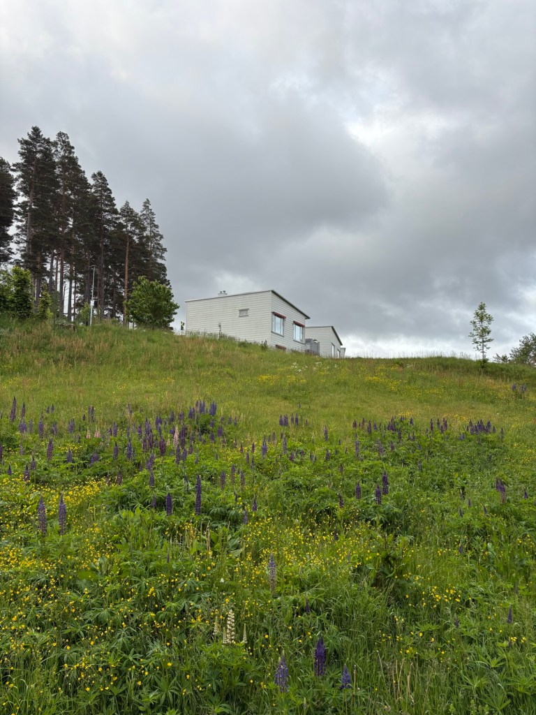 Jag tar ofta en kort morgonpromenad innan jag börjar arbeta. Jag stannade till och fotade en massa lupiner med vy upp mot mitt hus. Jag tycker lupiner är vackra men de senaste åren har det informerats om att de är invasiva så jag har tyvärr tagit bort de lupiner som växer uppe hos mig.