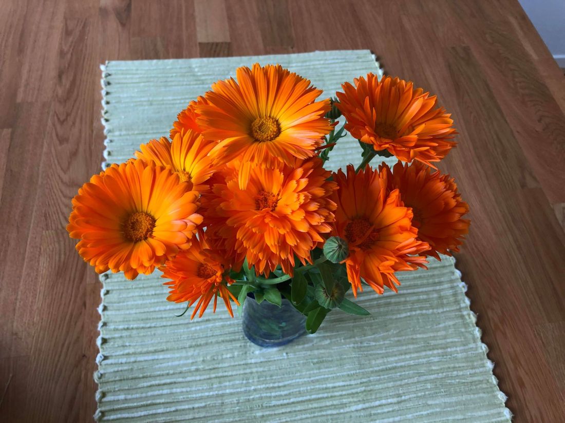 I början av sommaren sådde jag ringblommor för första gången i mitt liv. Nu har de verkligen tagit fart och blommar för fullt. Jag plockar några nästan varje dag. Det är så fint att ha i små buketter här hemma men också trevligt att ta med när man går till goda vänner.