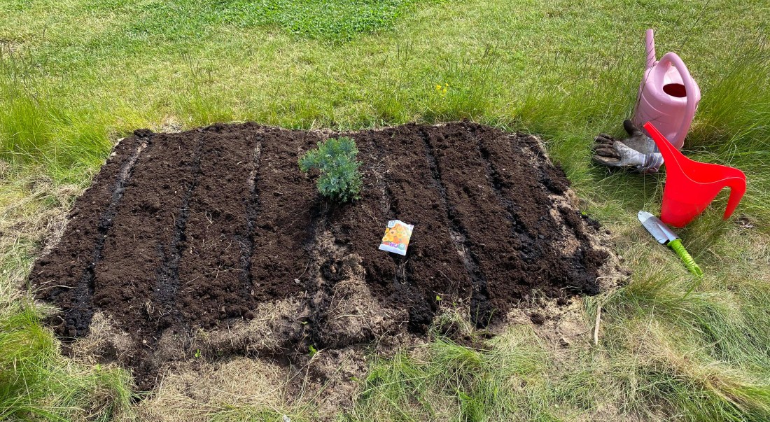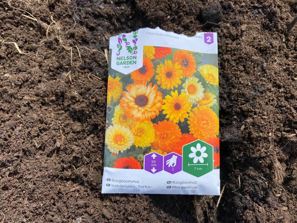 Jag älskar färg och har nu sått frön som jag hoppas ska gro och blir vackra orangea blommor. Jag har bara ett litet blomland men där är det fullt av andra växter. Jag gjorde ett experiment. När vi planterade buskar och rabarber fick vi gräva upp mycket matjord som vi lade på ett ställe. Jag bredde ut planteringsjord ovanpå detta och har nu sått ringblommefrön. Vore kul om det blir ringblommor framöver. Jag blir glad av den orangea färgen.