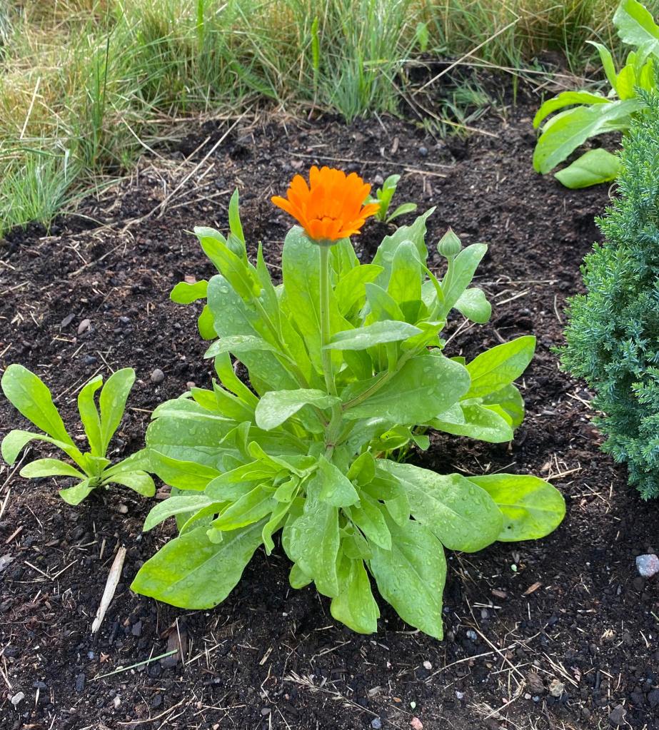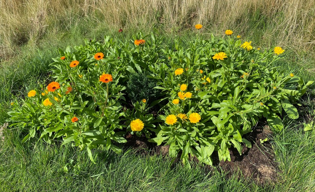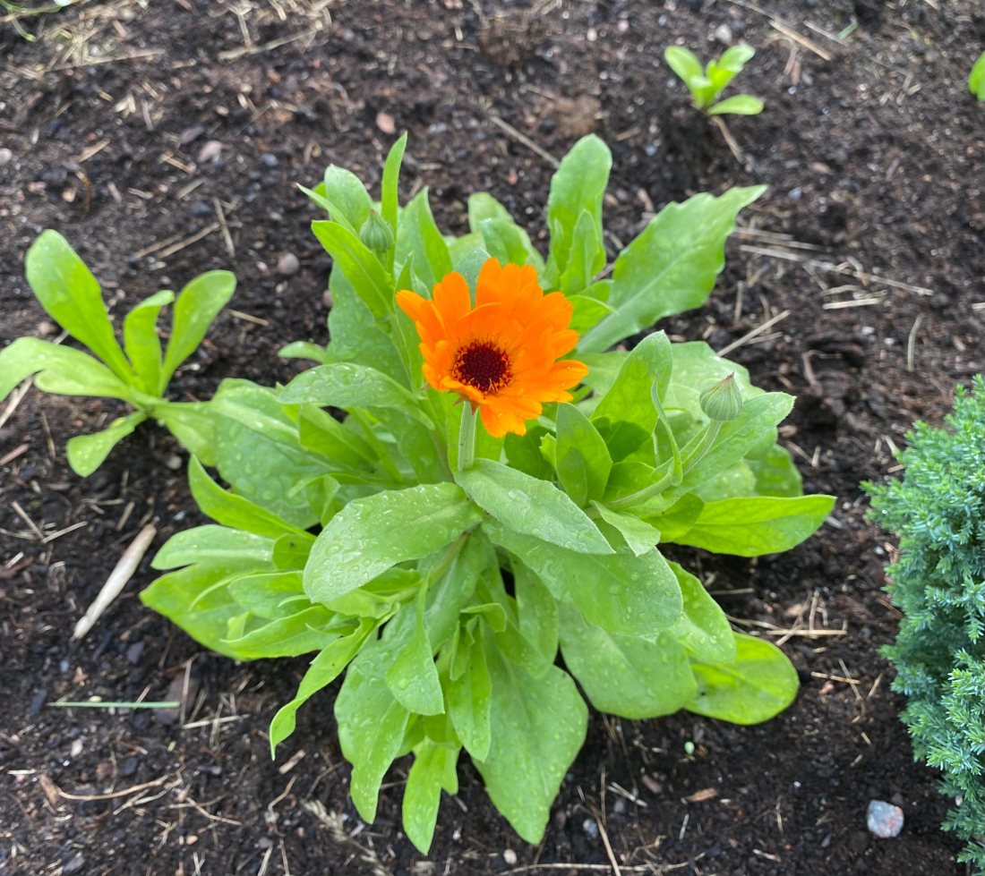 Jag har ett blomland som jag gjorde lite provisoriskt för ett par år sen. Förra året sådde jag ringblommor och nu har jag också sått aster. Den första ringblomman har nu slagit ut och jag gläder mig över det. Det kommer att bli ett hav av ringblommor framöver.